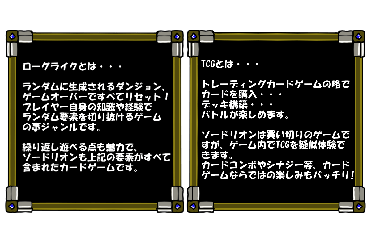 ソードリオンはローグライクとTCGの要素を掛け合わせたバトルロイヤル形式のアナログカードゲームです。カード1枚1枚に描かれた中世ファンタジーの世界でお馴染みの騎士や魔法使いを集め、ドラゴンや魔獣と戦います。ゲームに参加した全員が共通のダンジョンの山札を1枚1枚攻略していき、一番点数の稼いだプレイヤーが勝利となります。ランダム要素が強いため運7割実力3割のゲームバランスで、カードの組み合わせによっては永久コンボ的なハチャメチャな事もありえます。いきなりラスボスが登場したり毎回違ったドラマが生まれるのも大きな特徴です。