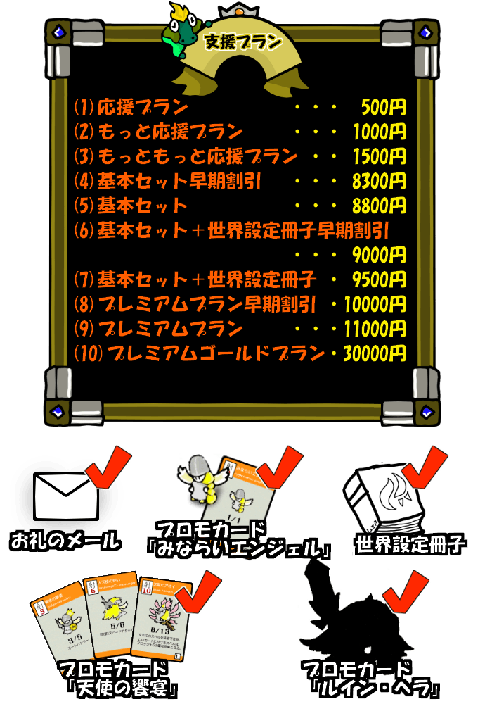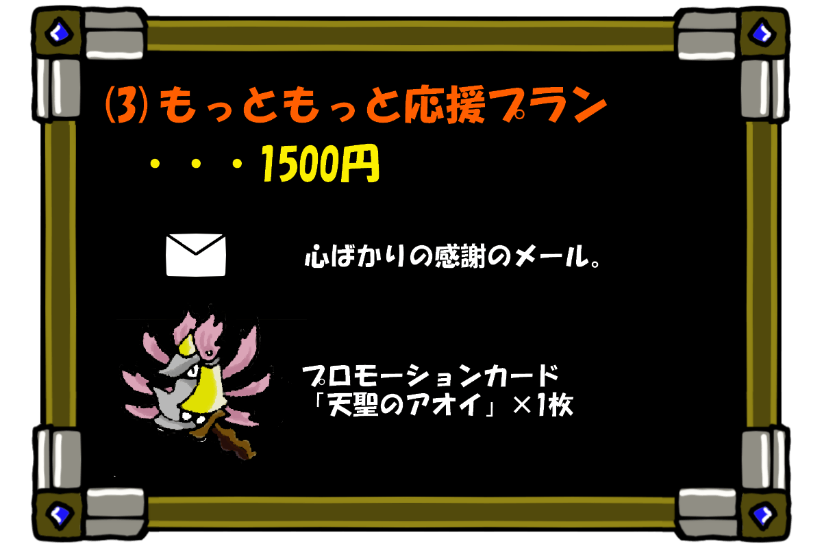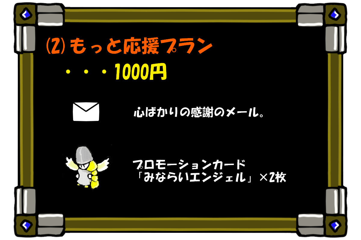 ストレッチゴールのカードの提供は基本セットのあるリターンを選んでいただいた支援者様が対象となります。応援プラン、もっと応援プラン、もっともっと応援プランのみの支援者様へは提供されませんのでご注意下さい。