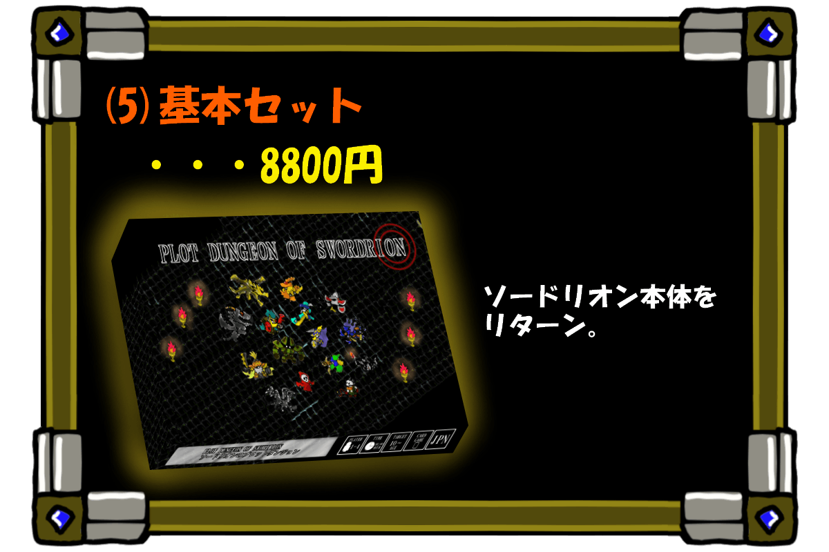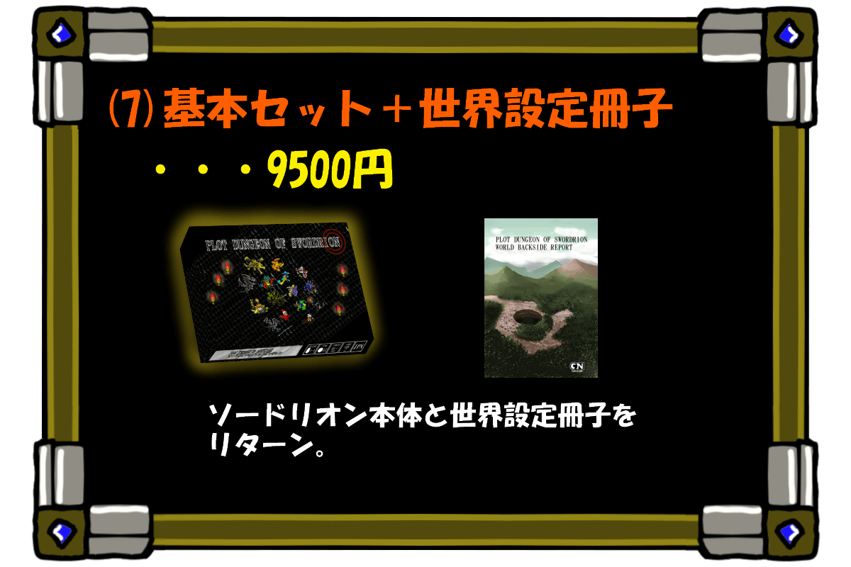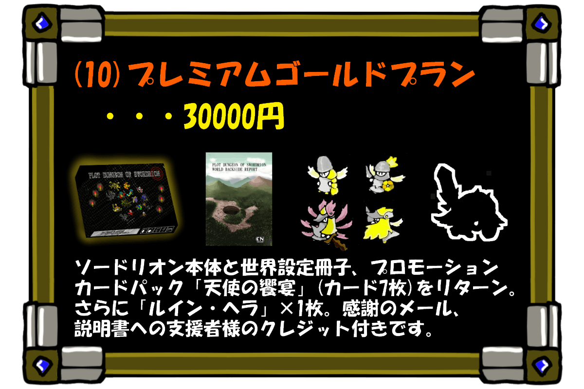 全部で10種類のリターンをご用意しました。ご支援金の上積みも大歓迎です。限定リターンもあるので好みに合わせて選んでいただければと思います。ソードリオンの基本セットさえあれば問題なく遊ぶことが出来ます。