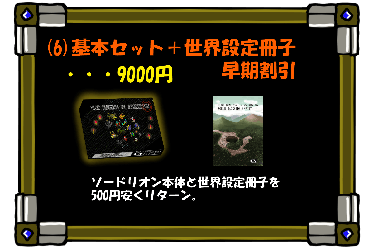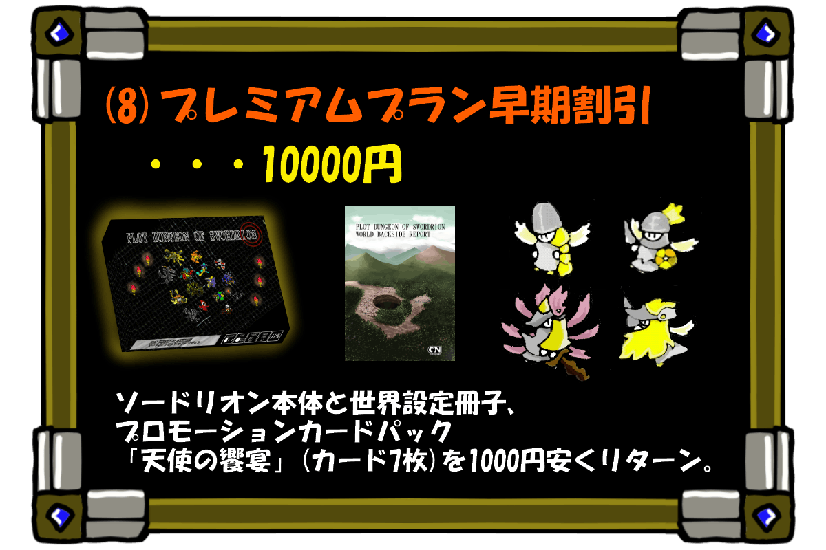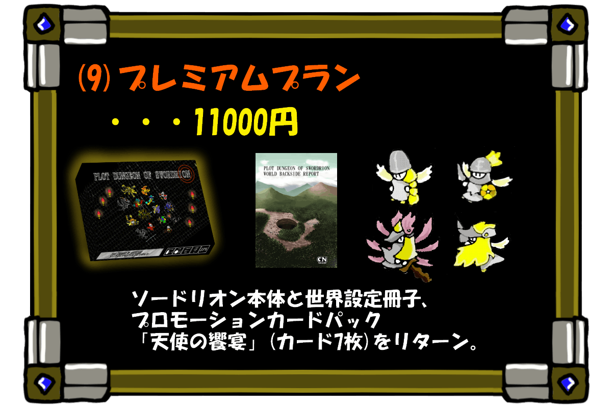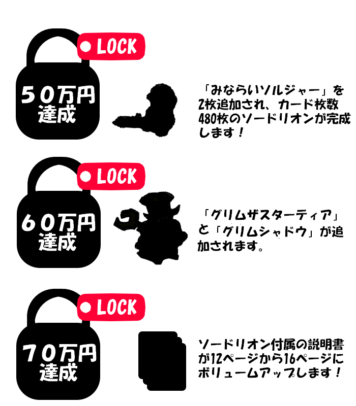 全部で10種類のリターンをご用意しました。ご支援金の上積みも大歓迎です。限定リターンもあるので好みに合わせて選んでいただければと思います。ソードリオンの基本セットさえあれば問題なく遊ぶことが出来ます。