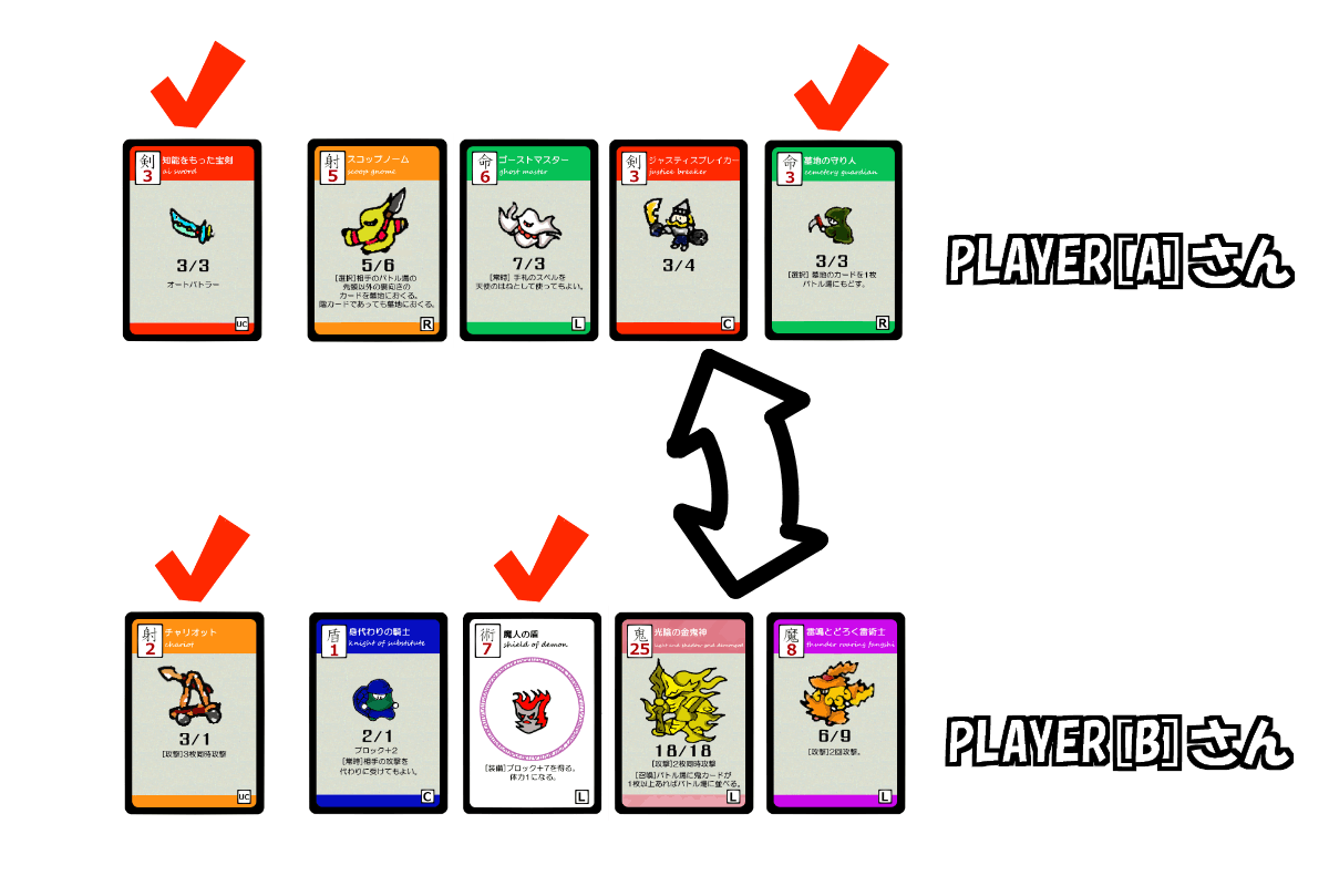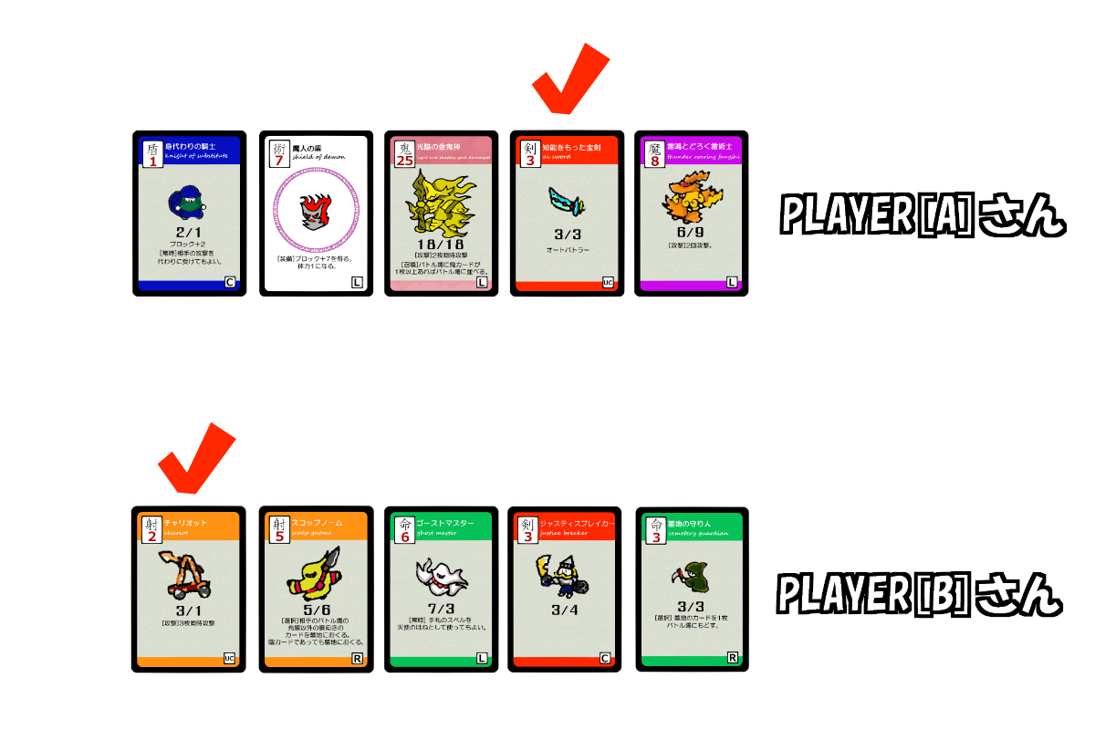 ルールを簡単に説明します。基本的にはカードを並べて左側のカードから順番に戦わせるだけでゲームは進みます。製品では説明書が付いてきますので安心してゲームをはじめる事が出来ます。