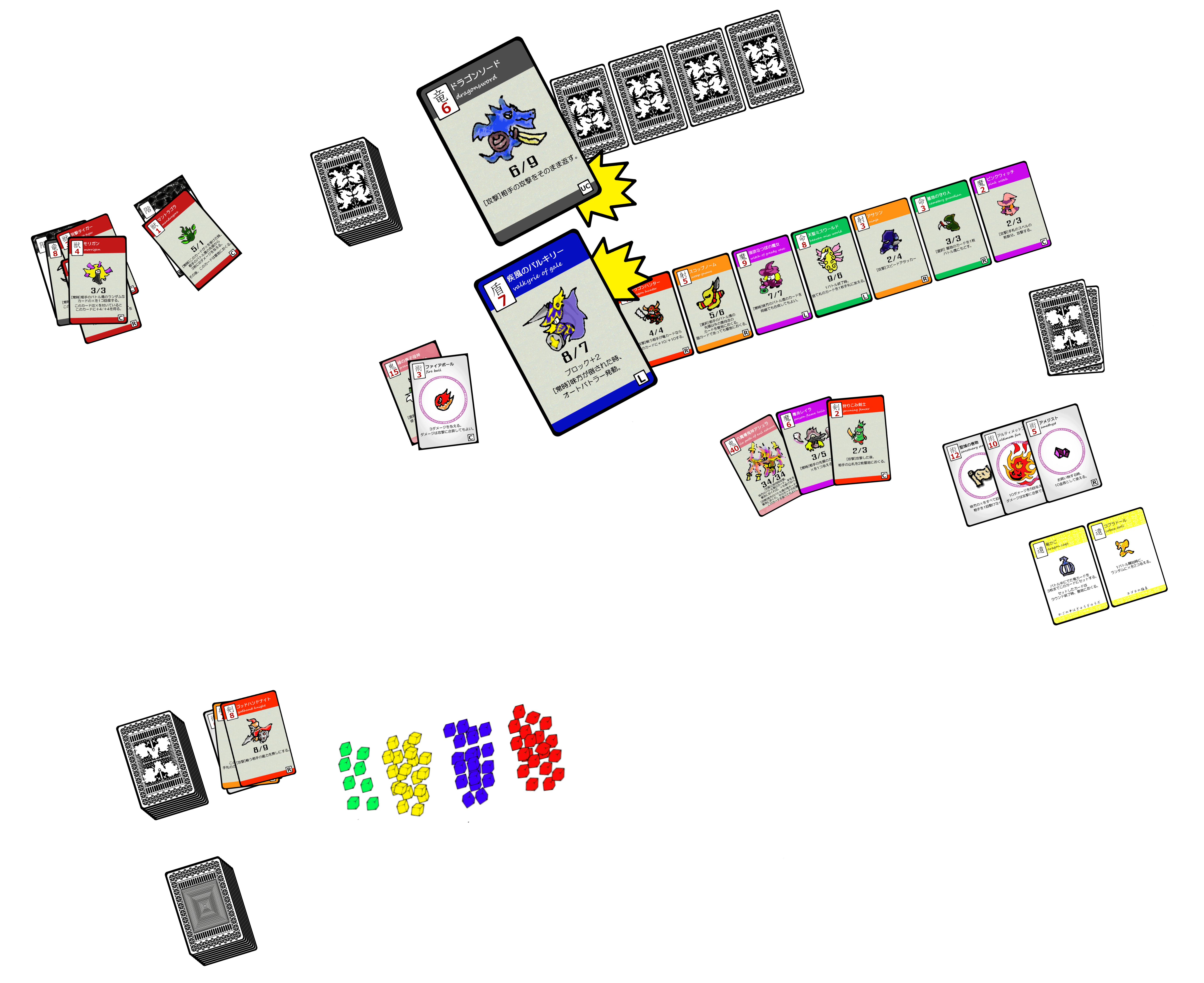 テストプレイ用の試作品を並べてみました。キューブトークンは製品版ではアクリル製となる予定です。実際の製品よりもかなり小さいカードサイズでプリンターで印刷しています。これが綺麗に印刷され製品に出来れば本当にうれしいです!