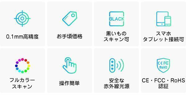 A:スマホとタブレットに接続して3Dスキャンする際は、専用アプリを無料でダウンロードしていただき、Androidの場合はアダプターデータケーブルまたWi-Fiで接続して3Dスキャンできます。iOSの場合は申し訳ございませんが、Wi-Fiのみ対応しております。