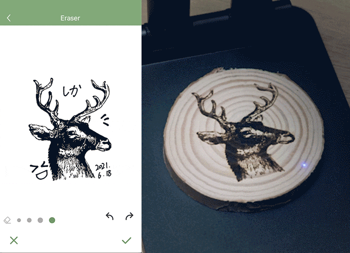 専用アプリから、出力度、深度、倍数の調整による彫刻効果の調整を実現!お持ちの材質と自分のデザインをあわせて、数値の調整によるお好みの作品に仕上げられます。