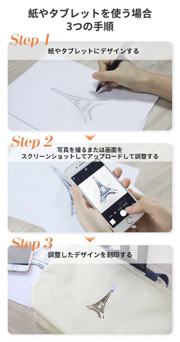専用アプリとBluetooth接続して、お気に入りの画像やデザインなどをアップロードするだけ、誰でも手軽に自分のデザインを刻印することができます!