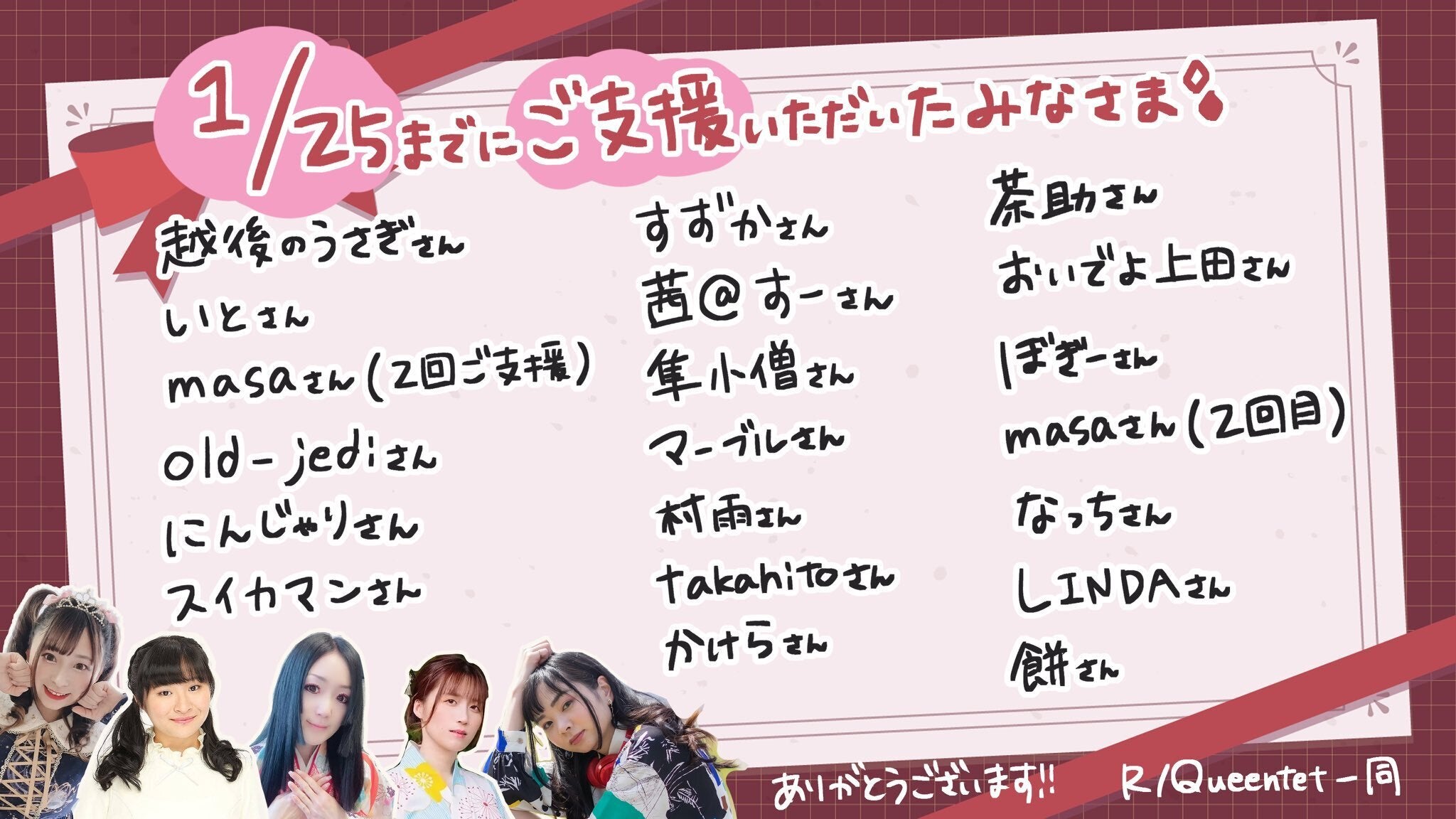 いつも応援ありがとうございます!R/Queentetメンバーの高坂です。本日で、R/Queentet信州音楽アルバム制作クラウドファンディング開始から期日でちょうど半分の日になりました!残り半分の日ということでもあります。今回は、1月25日までにご支援いただいた方のお名前を全員分手書きしましたのでご紹介させていただきます!上のメッセージにも書きましたが、このR/Queentetクラウドファンディングをご支援くださったあなたは、私たちR/Queentetの大切なメンバーの一員です!地域に貢献するって一見ぼんやりしているように見えて実ははっきり共通していることがあって、それは「信州が好き」ということです。私たちは普段、活動しているジャンルはバラバラです。ライブで歌を歌っているメンバー、お城でおもてなしをしているメンバー、ラジオ番組をやっているメンバー、子育てしながらアイドルタレントを頑張っているメンバー、絵と漫画を描いているメンバー、本当にバラバラです。でも、この信州が好きだという気持ちはみんなが持っている気持ちです。この気持ちで私たちは集まって、一つのチームを結成しました。一人一人ができることは限られています。とても小さなことです。でも、小さなものが集まればそれは大きなものになります。信州が好き、その気持ちで私たちはこれまで走ってきました。今回は、「音楽アルバムを作って信州を盛り上げる」この目標のもと、みんなで集まって一緒に走り出しました。途中で一人、また一人と一緒に走ってくださるご支援者の方が現れ、私たちはとても勇気づけられました。信州を盛り上げたいって少しでも思ってくれている方がこんなにもいるなんて、なぜかとても誇らしい気持ちでもあります。今、世の中は暗いニュースが続いています。長野県も例外ではありません。でも少しでも明るいニュースや話題があれば、元気になれる。それが地元や、自分が好きな土地だったらすごくうれしくなります。そして、その話題を見て新しくこの土地を好きになってくれる方も出てくるかもしれません。私たちは、あなたに信州をもっと「好き」と言ってもらえるように走り続けます。ゴールまではまだまだ遠くていくつも坂道があるけど…一緒に、走ってくれますか?残り半分、34日まずはクラウドファンディング企画成功に向けて全力で走り続けます!それでは、次の活動報告をお楽しみに!今回の活動報告:高坂梓