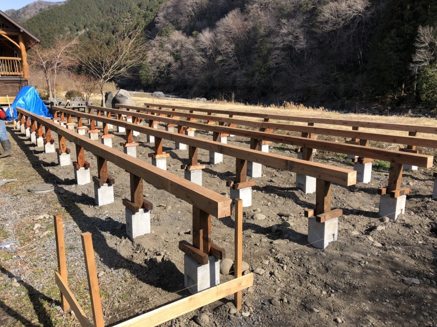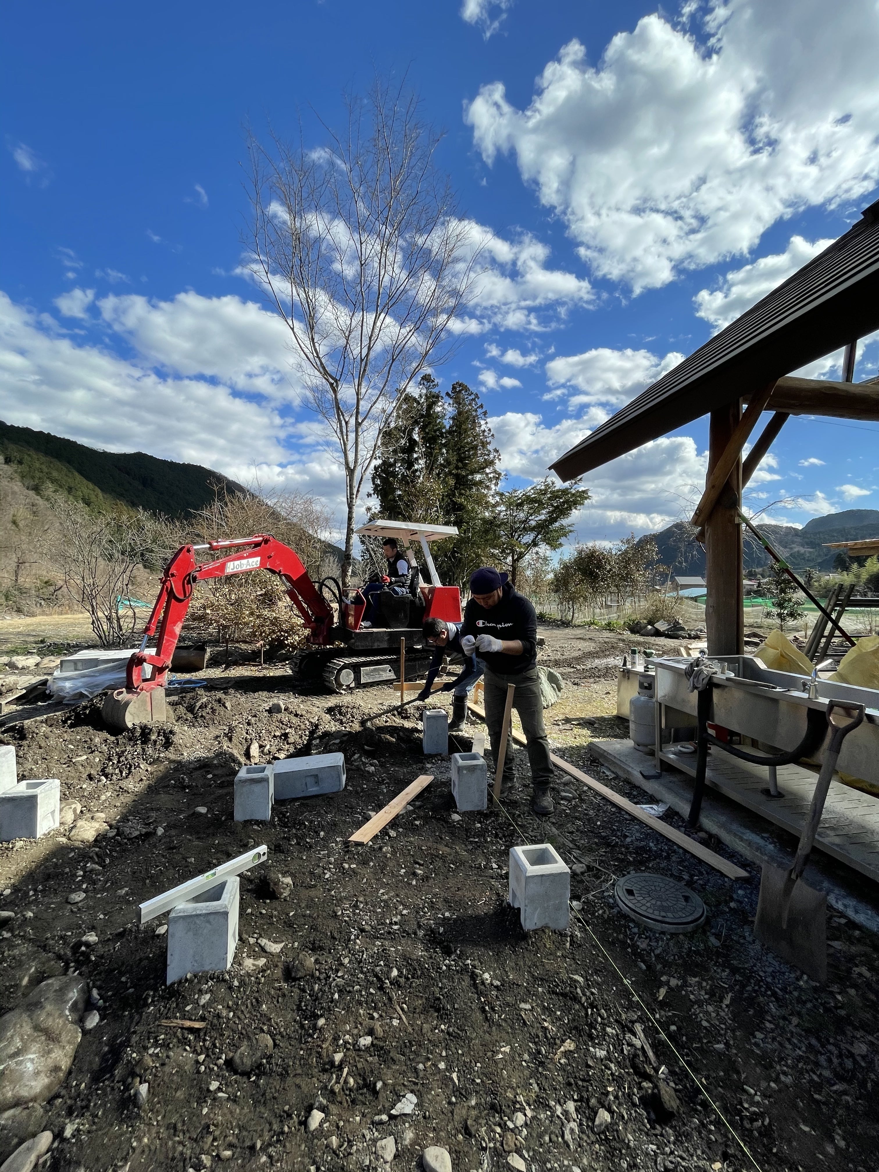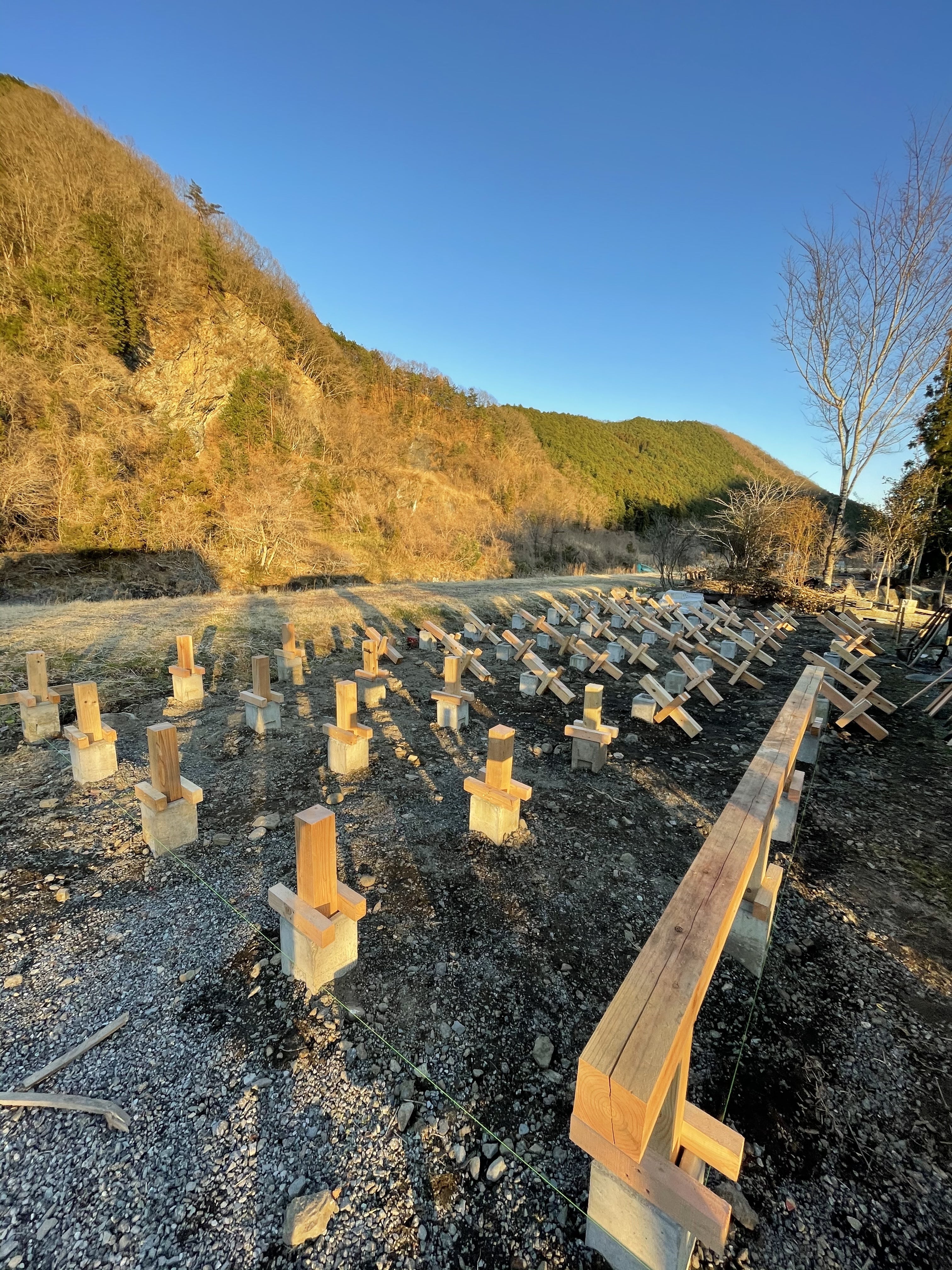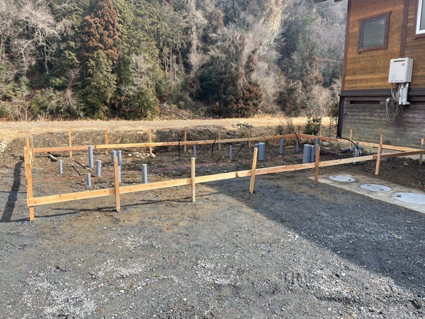 丁張りをすると、トイレ・シャワー棟のだいたいの枠組みが把握でき、より明確にイメージが湧きました!!
