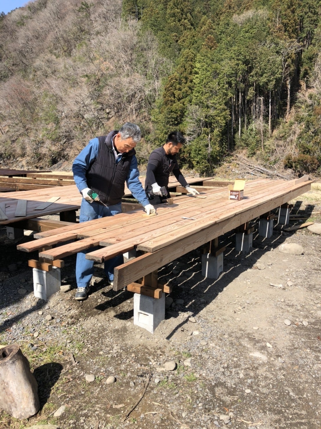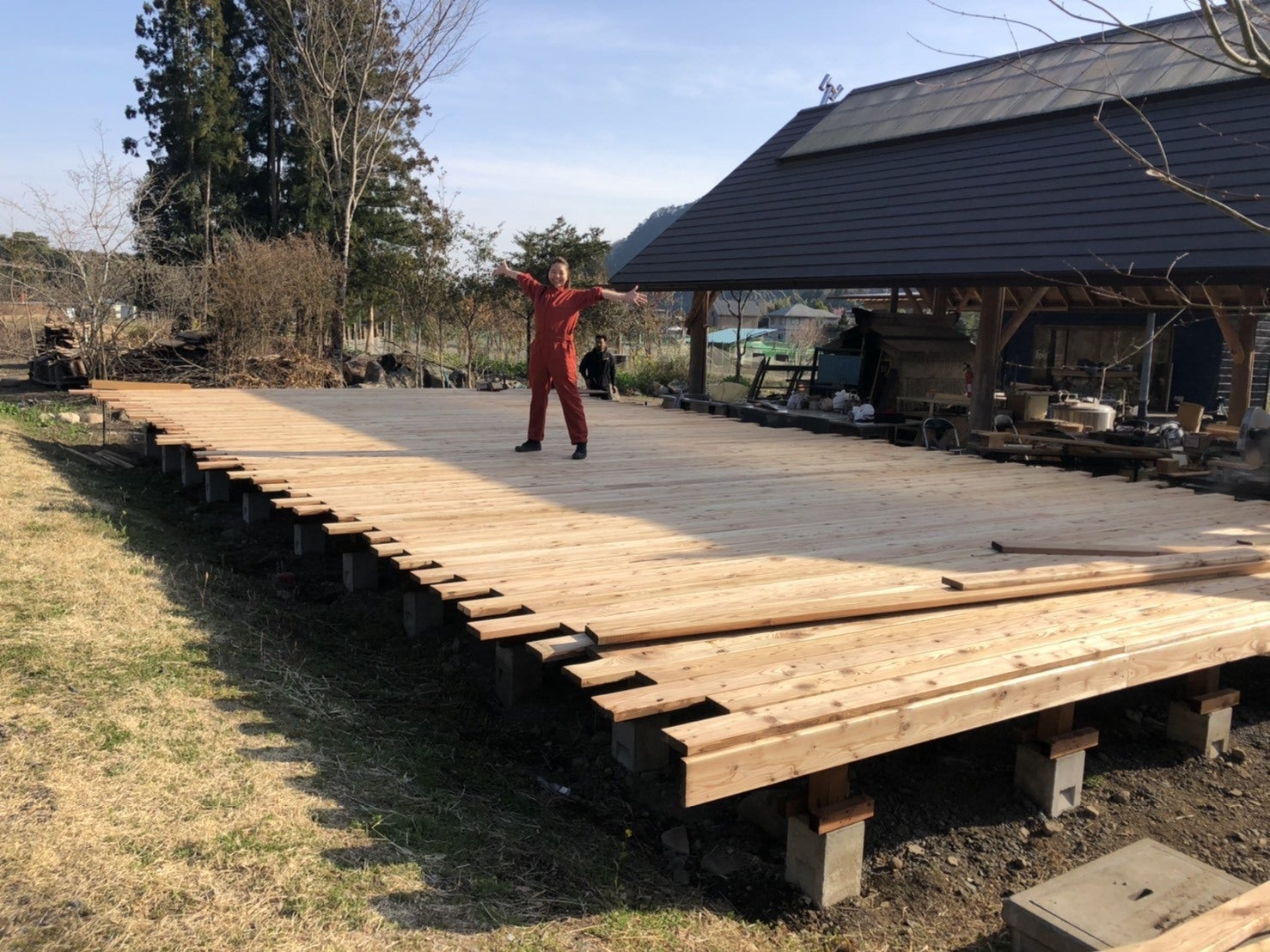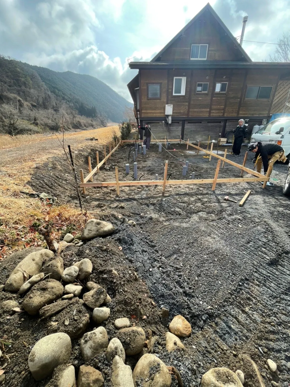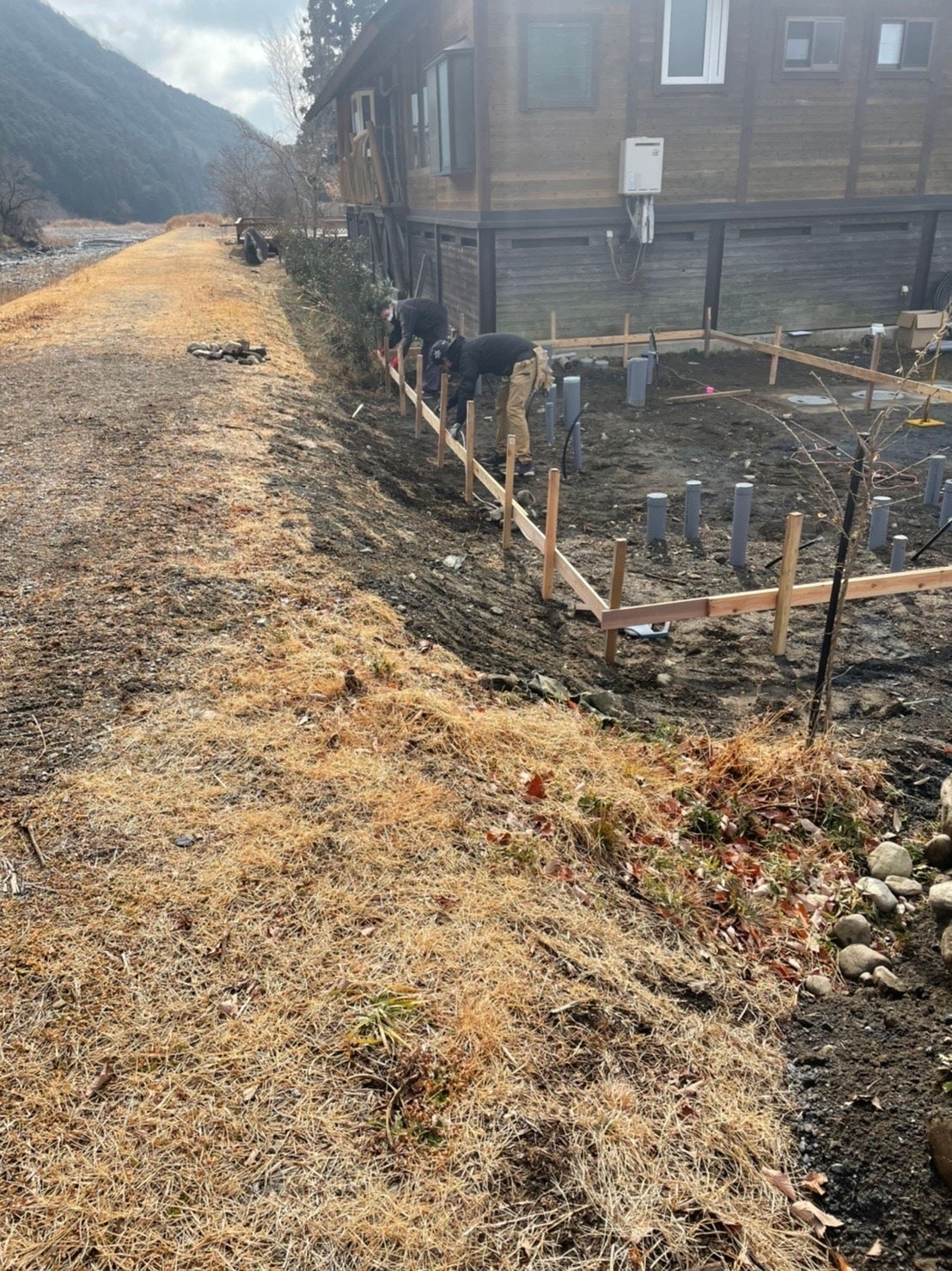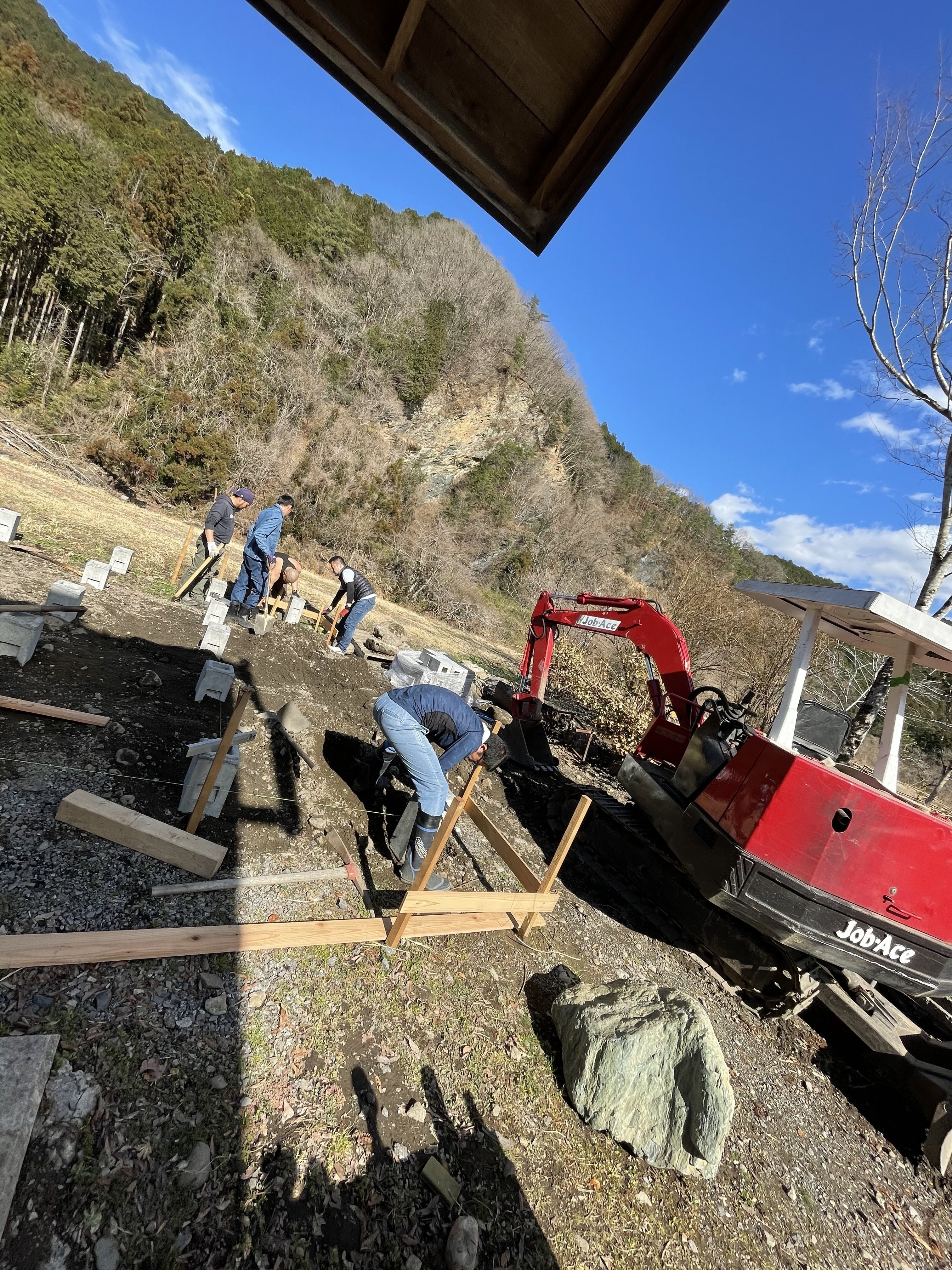丁張りをすると、トイレ・シャワー棟のだいたいの枠組みが把握でき、より明確にイメージが湧きました!!