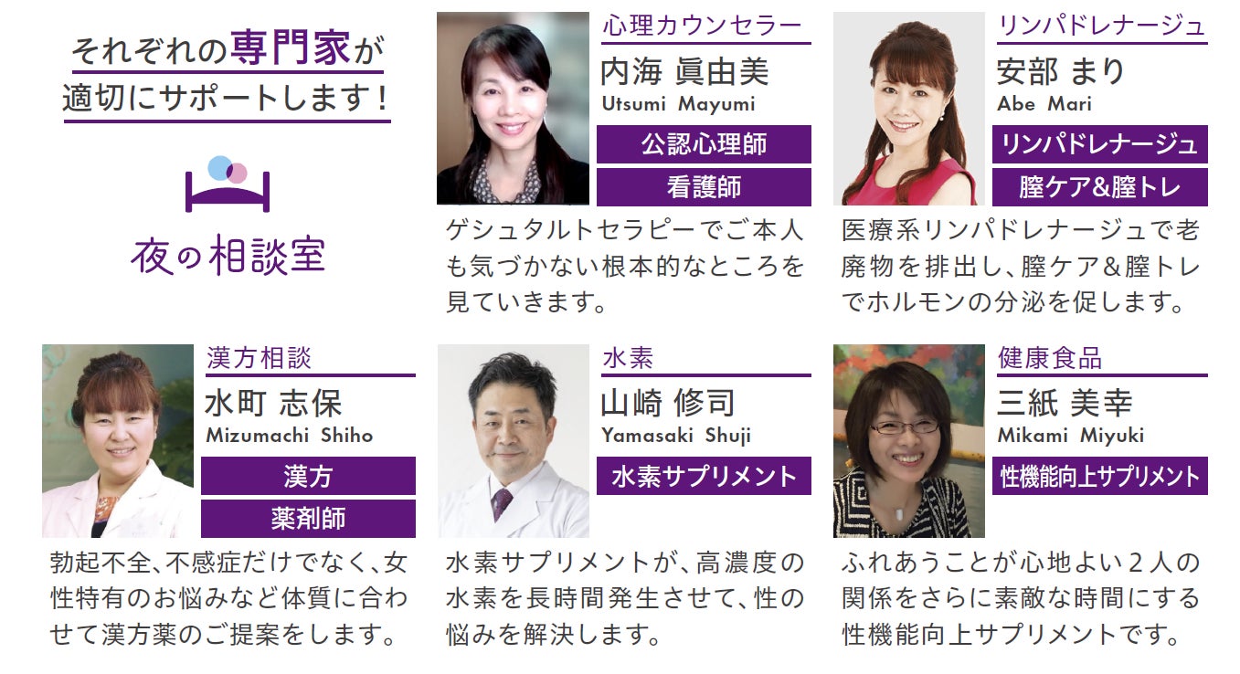 私たちは、みなさまの性の悩みを解決するために集結した、専門家集団です。心理カウンセラー・リンパドレナージュ・漢方相談・健康食品…一人ひとりの性にまつわるお悩みを解決するために、多方面からサポートいたします。