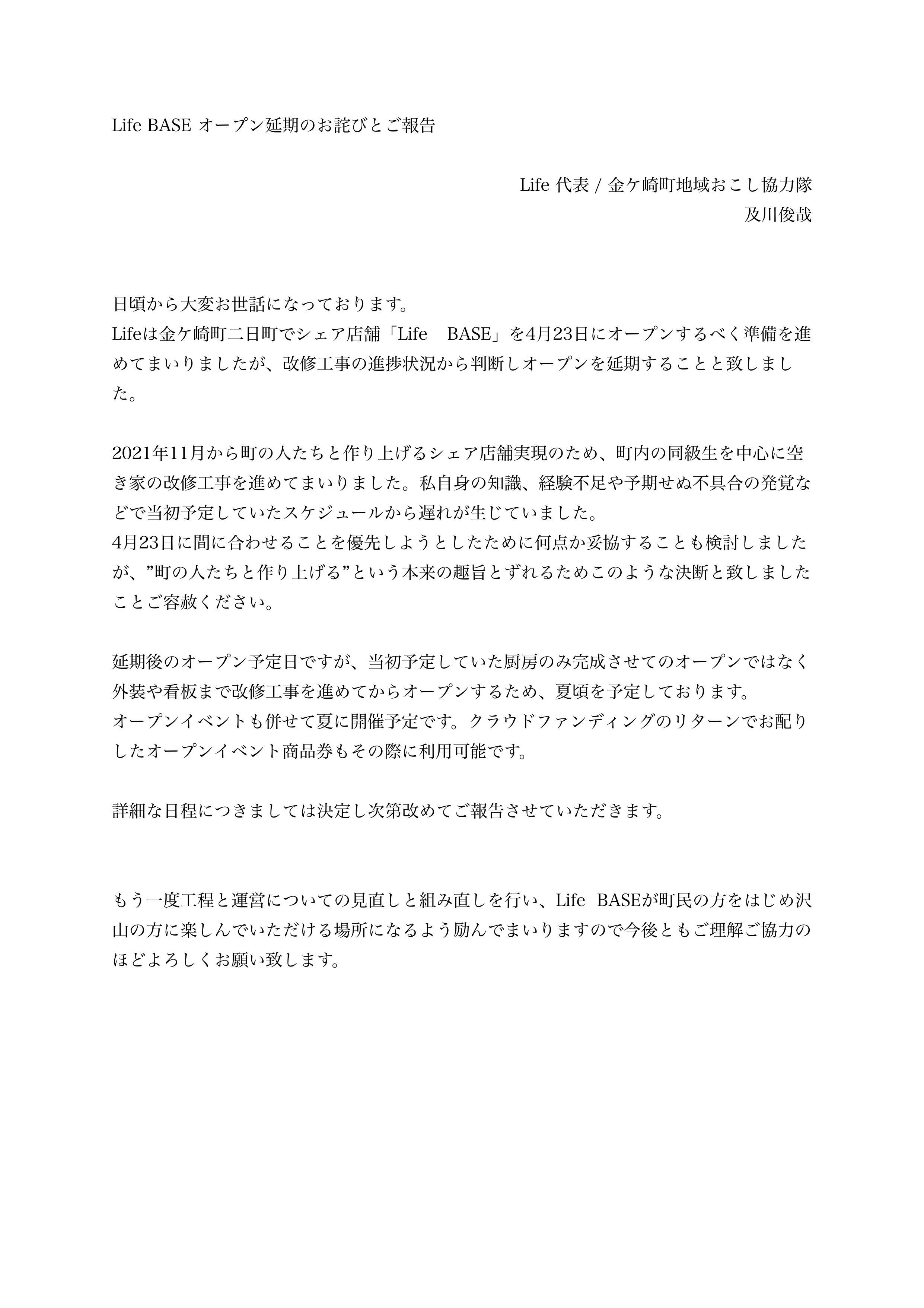 Lifeは金ケ崎町二日町でシェア店舗「Life BASE」を4月23日にオープンするべく準備を進めてまいりましたが、改修工事の進捗状況から判断しオープンを延期することと致しました。