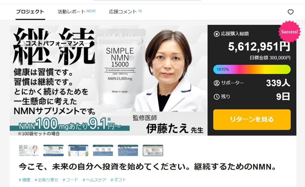 高コスパのNMNサプリメント 第2弾 Makuakeプロジェクトは残り9日です。