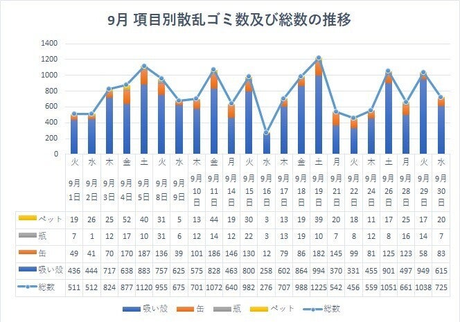清掃活動の際は集めたゴミを、空き缶・瓶・煙草の吸い殻・ペットボトルに分類し、手でカウントすることで、毎日のゴミの変化をデータ化しています。数値・グラフ化することで具体的なゴミの量や推移が伝わるようにしました。