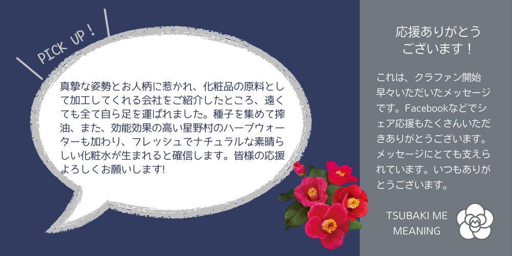 ご支援いただいている皆様に、「のこのしま椿油」をオイルインした希少な化粧水を完成後に お届けできるのが待ち遠しいです!