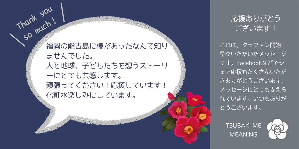 ご支援いただいている皆様に、「のこのしま椿油」をオイルインした希少な化粧水を完成後に お届けできるのが待ち遠しいです!