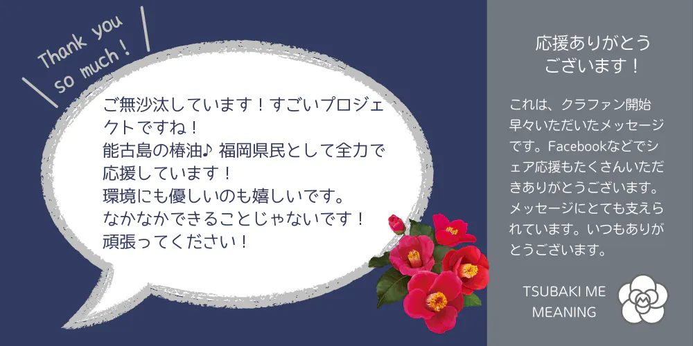 ご支援いただいている皆様に、「のこのしま椿油」をオイルインした希少な化粧水を完成後に お届けできるのが待ち遠しいです!
