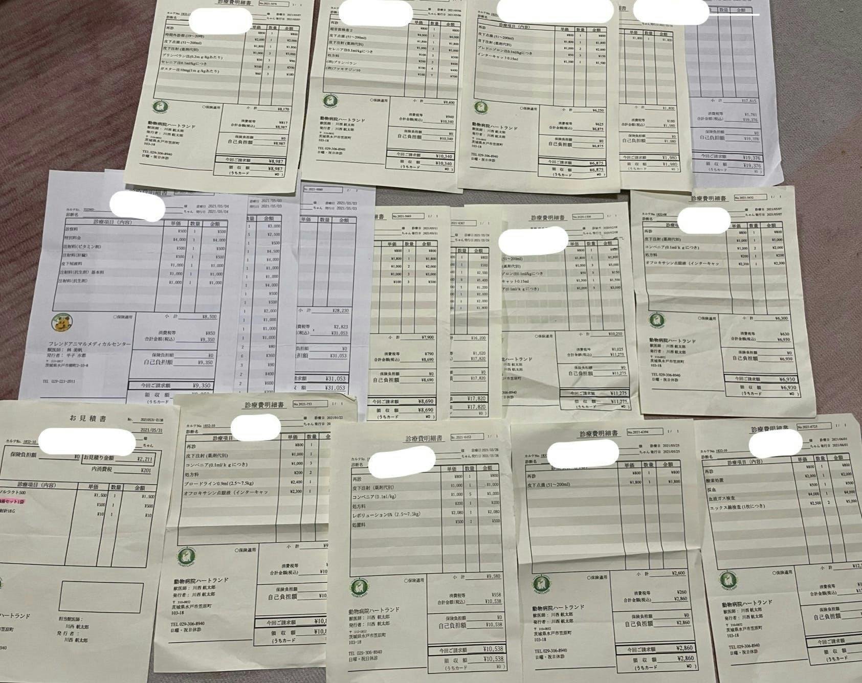 今年の直近数ヶ月の医療明細だけで写真に映る範囲だけでも医療費は全額自己負担なので何十万と言う額になります。まだまだ医療明細は載せきれないのですが、×4年になりますので猫ハウスが2つは建つ金額になっております。