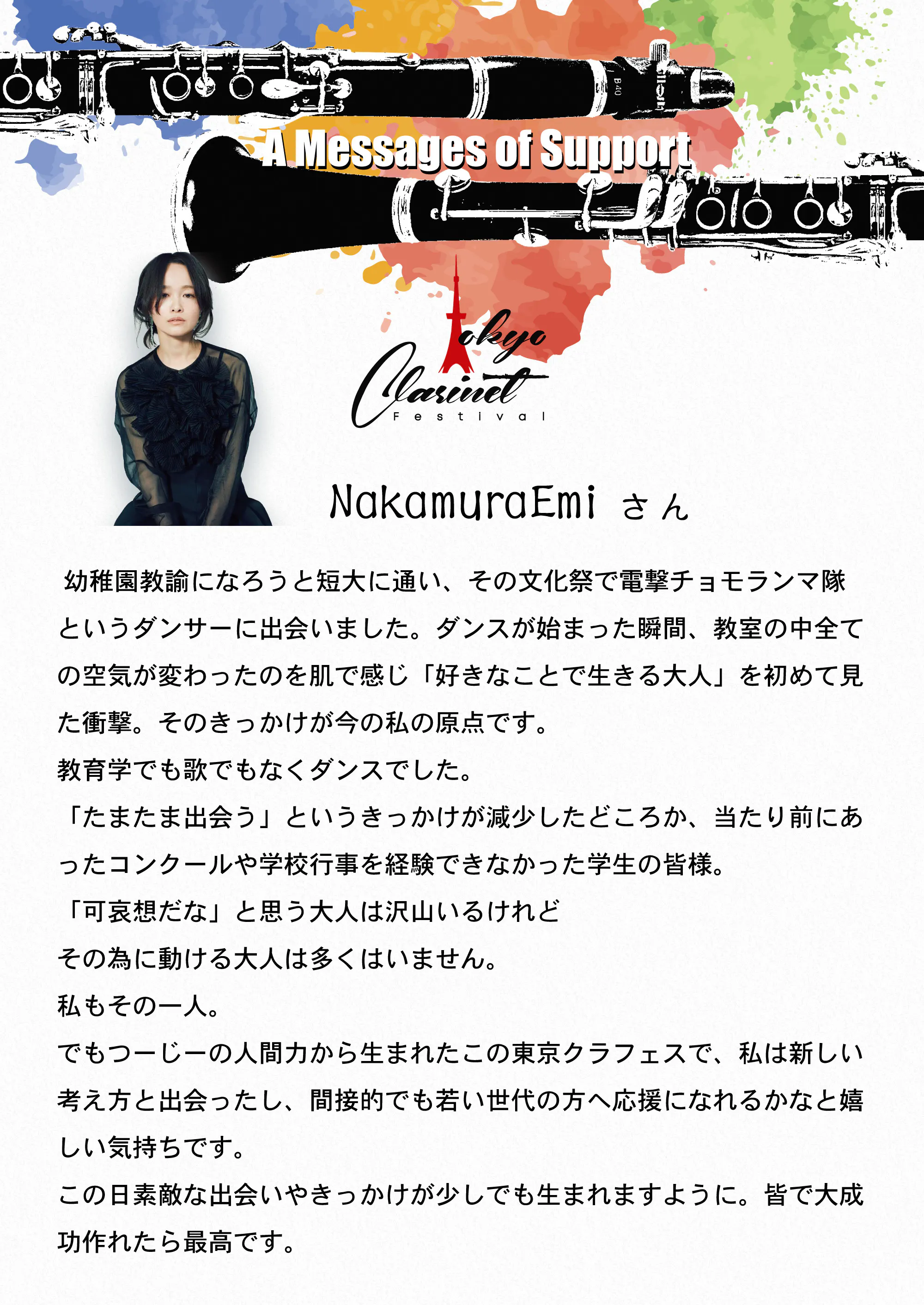ただ、わたくし一人の力ではあまりにも微力なので、新時代のクラリネットシーンを盛り上げているクラリネットプレイヤー(クリエイター)たちと一緒に、そしてこのプロジェクトを応援してくださる皆様からお力を貸していただきながらつくり上げていけたらと思っています。
