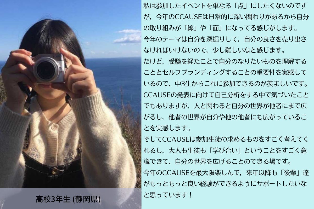 「あの後学校でも軽いプレゼンをする機会があったのですが、CCAUSEに参加するまでは英語で話すことに少し抵抗がありました。表情やジェスチャーを付けたり、ワードに気持ちを込めたりするのが恥ずかしいとどこかで思っている自分が居たのだと思います。でもALTの先生やクラスメイトに今までで1番良かったと言って貰えました!!「プレゼンはプレゼント」ということをきちんと心に留め、今後機会があれは相手に響くようなプレゼンをしていきたいです。」