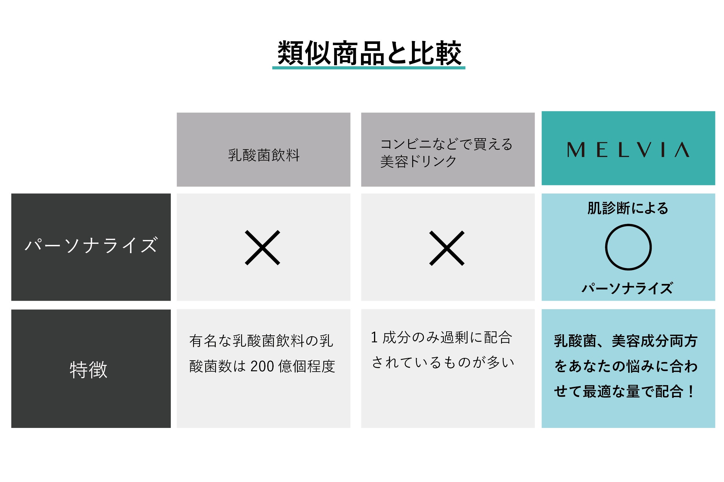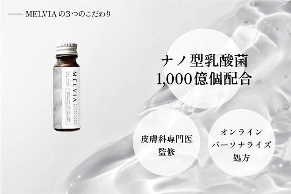 MELVIA(メルヴィア)はこれまで別々に摂取していた乳酸菌飲料と美容サプリメントを掛け合わせることで1本で腸活 (内側ケア)と肌活(外側ケア)へのアプローチを可能にしました。処方する美容成分はオンライン診断から肌の悩みに合わせてパーソナライズ。あなただけのあなたのための最適なインナービューティーケアを実現いたします。