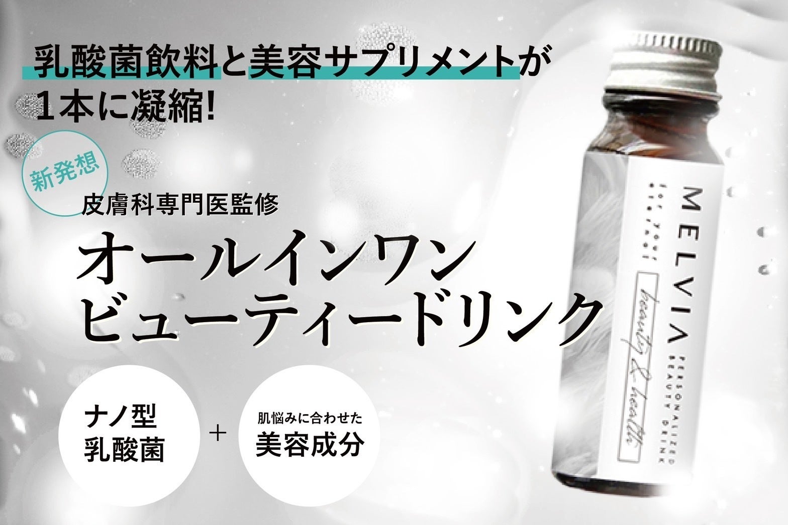 まずは美容成分の前に根本的な身体のベースを整え健康維持を目指すことが大切なため、MELVIAでは約1,000億個ものナノ化処理された乳酸菌を配合しております。