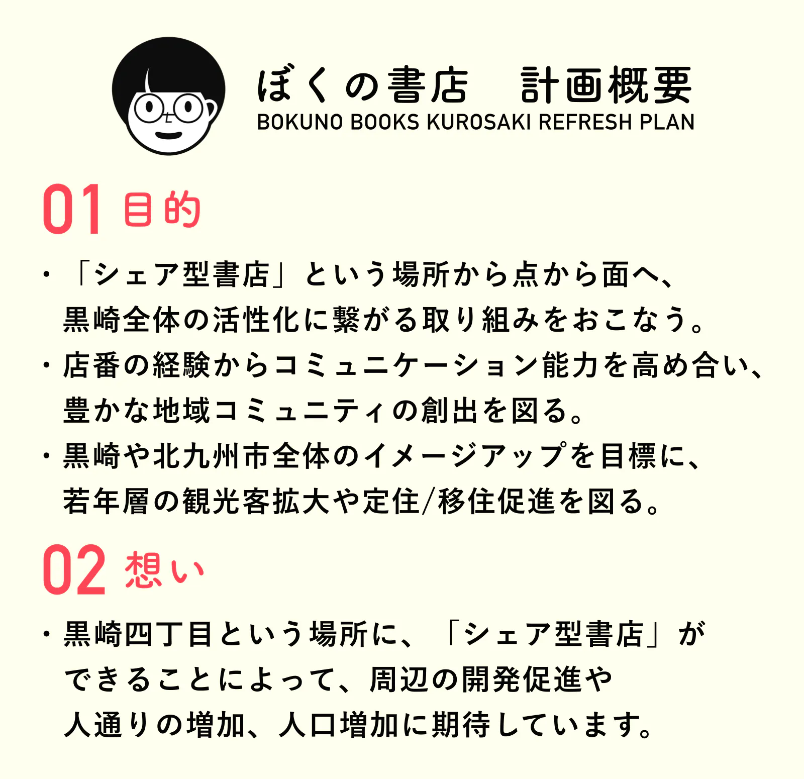 2022/03/17 10:34ぼくの書店(代表:大西貴也)は、2022年4月3日(日)福岡県北九州市八幡西区に、長屋の一室を改装し本棚を設置して、その区画を貸し出して本棚オーナーさんと共同で運営を行うシェア型書店「ぼくの書店(BOKUNO BOOKS)」(以下、当施設)をオープンいたします。また、3月26日(土)に、家族・知人・支援者様向けにプレオープンも実施いたします。ぜひお誘い合わせの上ご来場お待ちしております! 当店は、「撥川沿いの古民家実験室」をキーコンセプトに、本棚の区画ごとに異なる商品の販売や、本棚オーナーさんの店番を通じZ世代からアクティブシニアの方々など、その時代の文化に触れる交流イベント等を企画し『持続的な賑わいを生む場所』として感性を刺激しコミュニケーションを育める場を目指して参ります。【ぼくの書店(BOKUNO BOOKS)施設概要】・施設名称:ぼくの書店(BOKUNO BOOKS)・所在地:福岡県北九州市八幡西区黒崎4丁目4−11・代表者:大西貴也・本棚区画数:50区画(最大で80区画まで増設可能)・取扱物販予定ジャンル:書籍・雑貨・ハンドメイド作品・アート 等・営業日:金・土・日 11:00〜19:00 (5月以降の営業体制については、決まり次第発表)・周辺人口(八幡西区):およそ25万人(2020年度)・アクセス:JR黒崎駅から徒歩約5分・都市高速 黒崎インターから車で約7分--------------------------------------2.当施設の場所 当施設は、商業、医療・福祉、文化・交流、交通拠点など多様な都市機能が集積している九州初の政令指定都市「北九州市」の副都心である『八幡西区黒崎』にあります。八幡西区役所やバスターミナル等が入居する「コムシティ」、そしてJR黒崎駅からも徒歩約5分とアクセス利便に優れた場所に立地しております。 施設周辺は、九州一の交通量を誇る国道3号線や、国道200号線に挟まれており、徒歩3分圏内にコインパーキングも多数あります。3.様々な取り組みについて【取り組み1】▶︎「本棚の区画を貸し出し、本棚オーナーとなって発信できる場の提供」 月額2,000円(U22 学割)1,500円の料金で、約30cm四方の本棚をレンタルしていただき、本棚オーナーさんが並べます。このサービスは「ブックマンション」等全国的にも広まりつつある取り組みで、ご自身で販売価格も決めていただき、本以外にもレコードやハンドメイド作品等も販売することが可能です。また、本棚オーナーさんは、数ヶ月に一度の頻度でお店に立っていただく『お店番』ではお店を訪れたお客様との交流も楽しんでいただけます。【取り組み2】▶︎「特集棚(催しテーブル)の企画・運営」 およそ1ヶ月ごとに特集を組み、ある1つのモノやコトにフォーカスを当て、本棚オーナーのみなさまと一緒に制作し、さまざまな書籍や雑貨を販売します。【取り組み3】▶︎「世代を超えた文化の体験・ワークショップ開催」 コロナウイルス等感染症の流行状況・社会情勢で判断し、アナログレコードを筆頭とする『昭和レトロ』の世界に触れる体験や、絵本の読み聞かせ等のイベントを開催します。(まん防・緊急事態宣言の期間中は中止とします。)【今後のスケジュールについて】2022年3月23日:本の搬入開始2022年3月26日:プレオープン(家族・友人・支援者様向け)2022年4月3日:グランドオープン(予定)全ての本棚区画が埋まっていませんが、開業後段階的に埋まっていくことを見込んでおります。 もっと見る