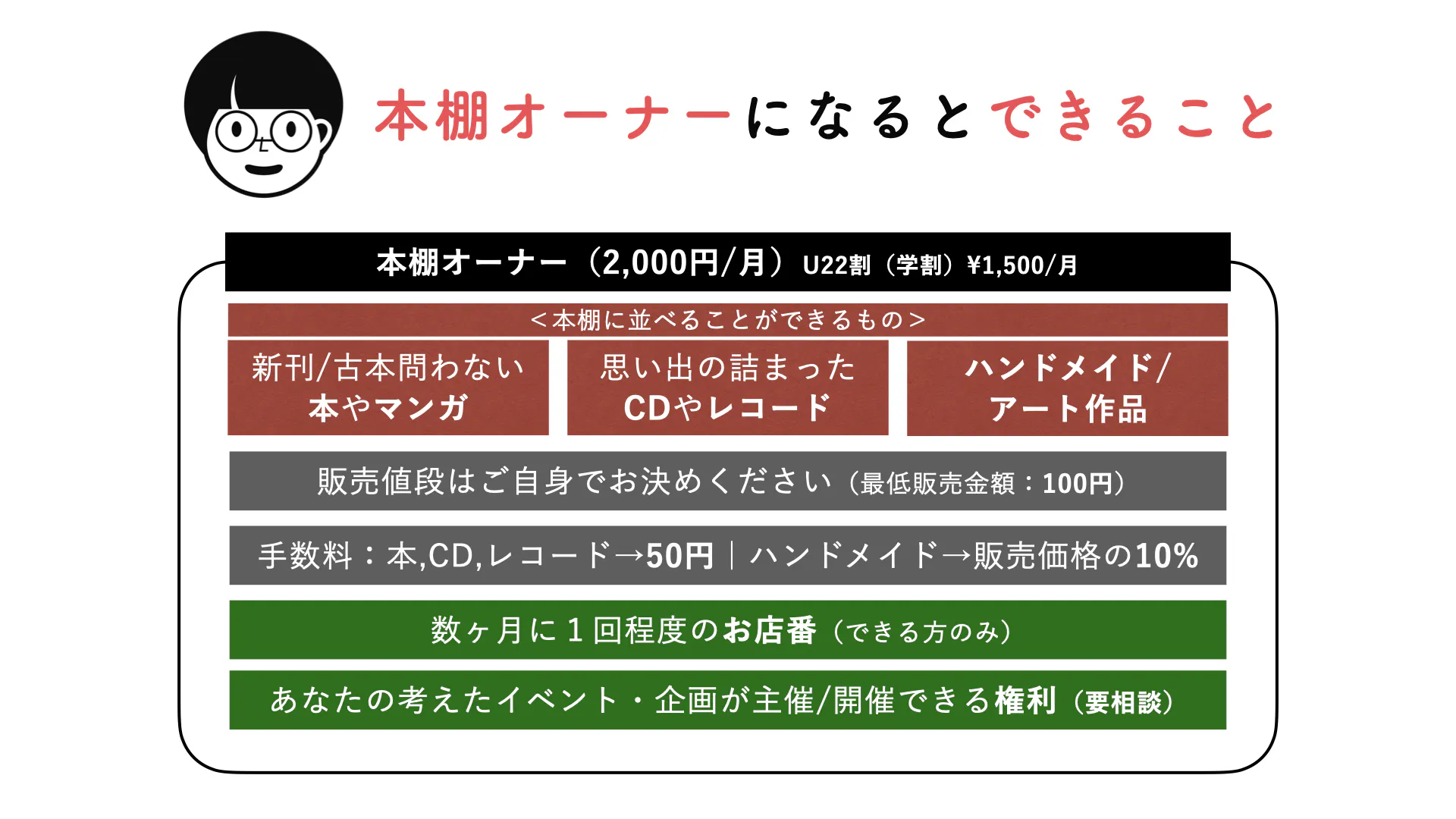 黒崎まで通える近隣の本棚オーナーの方には、数ヶ月に1回程度「店番」をしていただきます。(もちろん僕もします)(人件費は出ません)