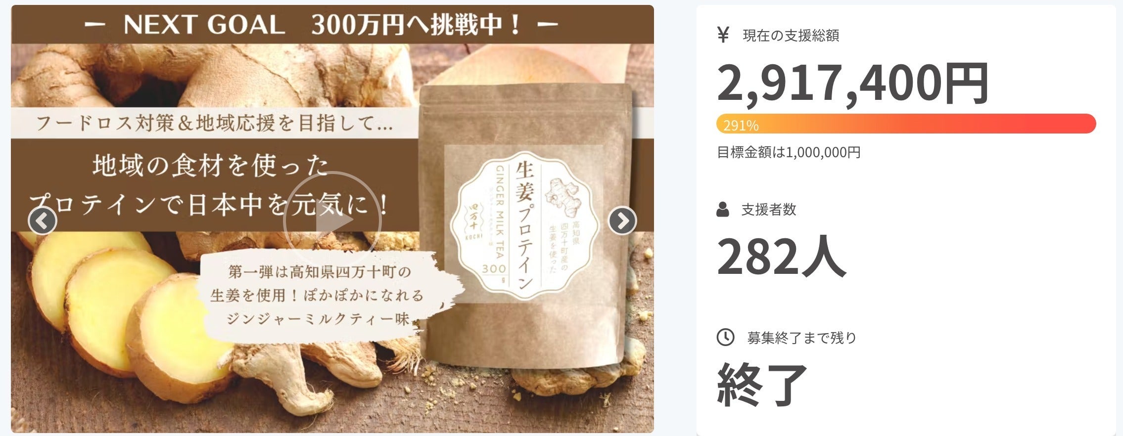 いただいた応援は、まずは四万十町の生姜をしっかりと広めていくこと、そして「地域おこしプロテイン」を他エリア含めて地域応援と社会貢献の輪を広めていくことに使わせていただきます。