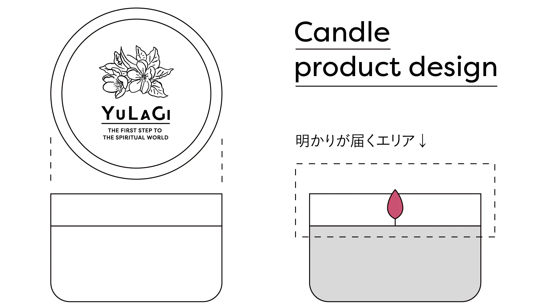 その為、F.YULAGIのキャンドルでは上記の図の様に缶の高さを低く、幅を広めに取ることで火の光をできるだけ缶の外に出さない様にしています。