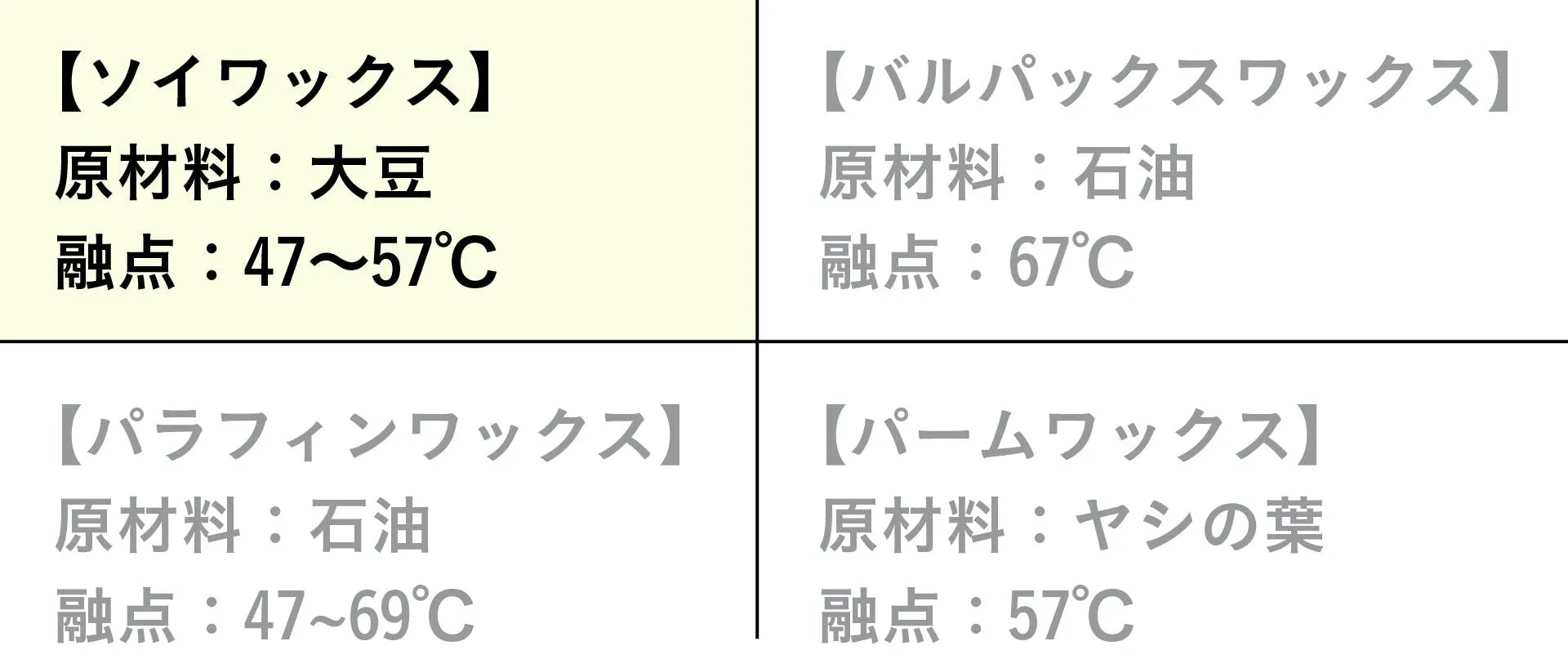 また融点は47~57度と低い温度で溶け、固形から液体になるのが早いので香りの広がりもよく、燃焼時間も長くお楽しみ頂けます。