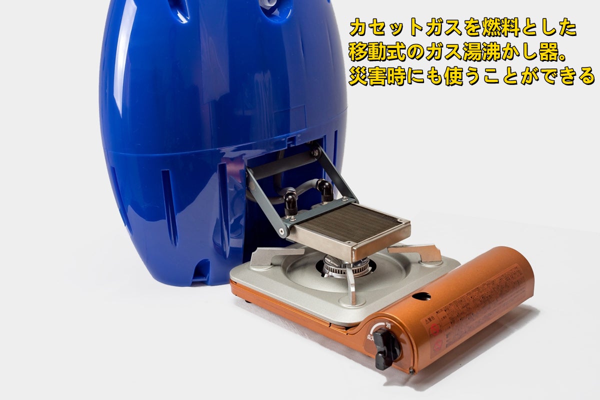●コンビニでも手に入るカセットガスを燃料とした移動式のガス湯沸かし器。
