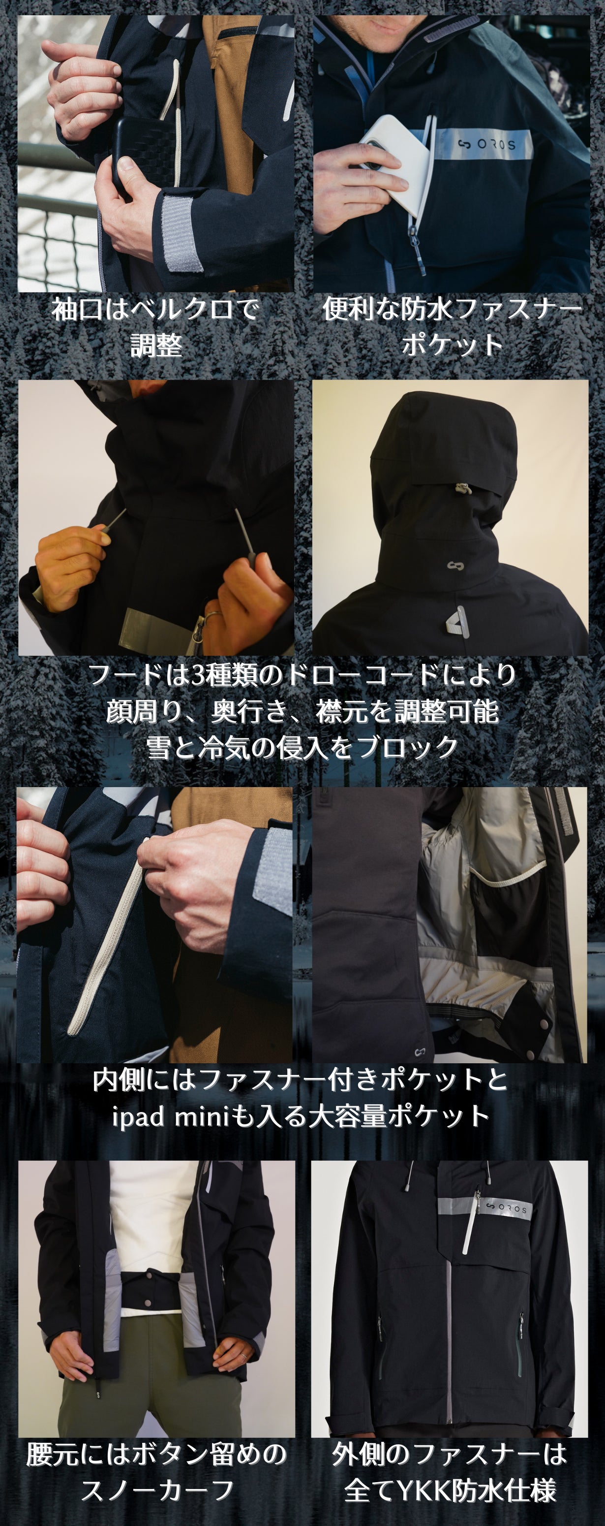 実はDWR加工はPFCと呼ばれる環境に害を与える化学薬品が使用されているケースがありますが、OROSは環境保護への取り組みとしていち早くPFC Freeによる加工に取り組み始めました。防水レベルをしっかり確保しつつ、環境への配慮も欠かしません。