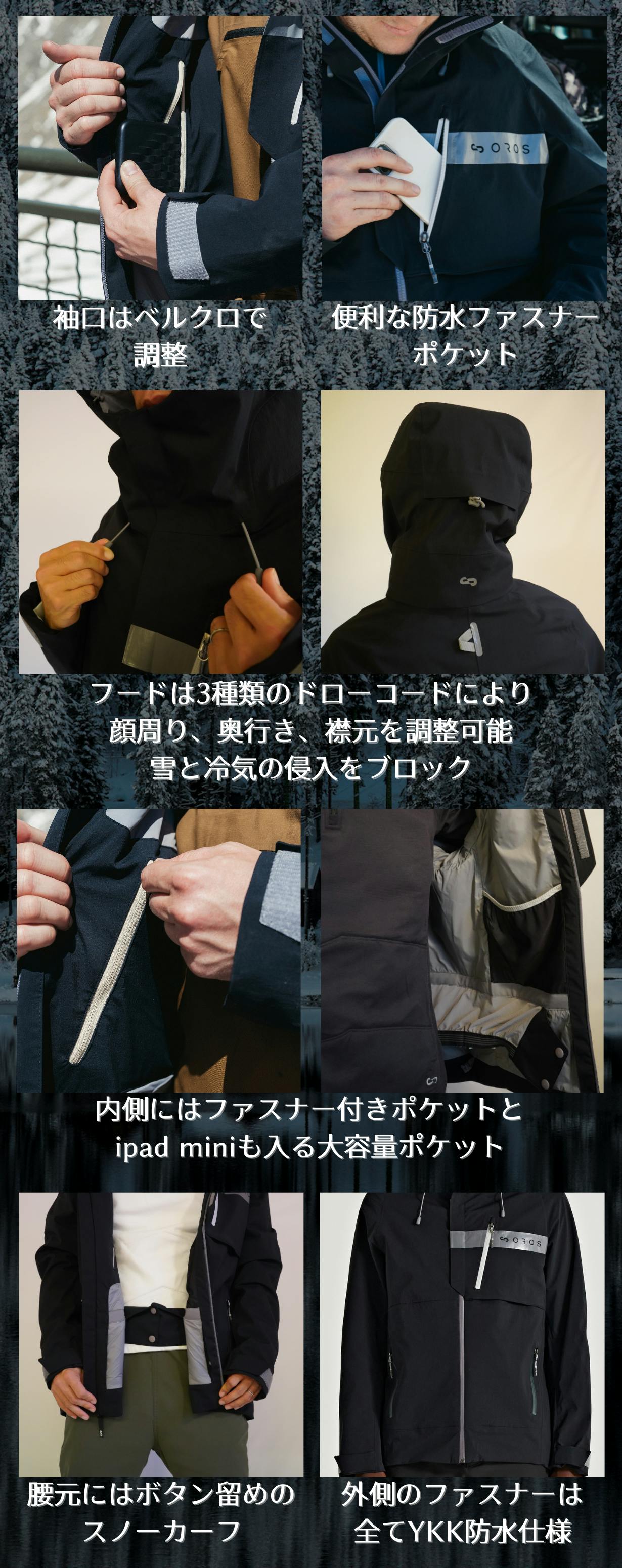 エンデバージャケット2021は確かな防水性能に加え、襟元・手首・腰元の外部と接触しやすい部分が全て調節可能な仕様となっているため雪の侵入を完全にシャットアウトし、快適に遊べます。