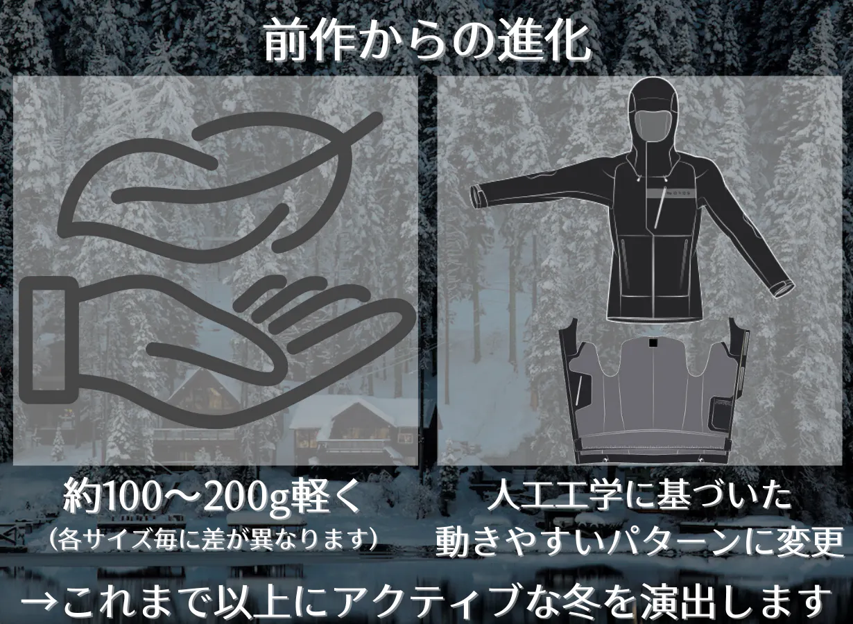 課題となっていた重さについて、約100〜200gの軽量化を実現した他、人間工学に基づいた動きやすいパターン設計へ変更しました。その結果、可動範囲が拡大したことにより1ランク上の着心地・快適さを実現しました。