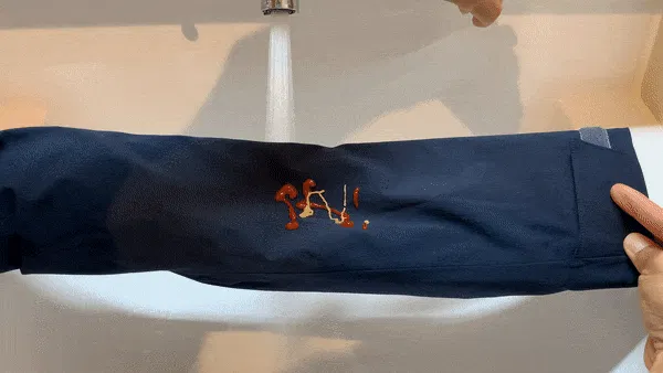 エンデバージャケット2021なら、ケチャップ、マスタード等の濃度の高いどろっとした液体が掛かっても大丈夫!水をかけることで簡単に落とすことができます。また、染みが残ることはほとんどありません。