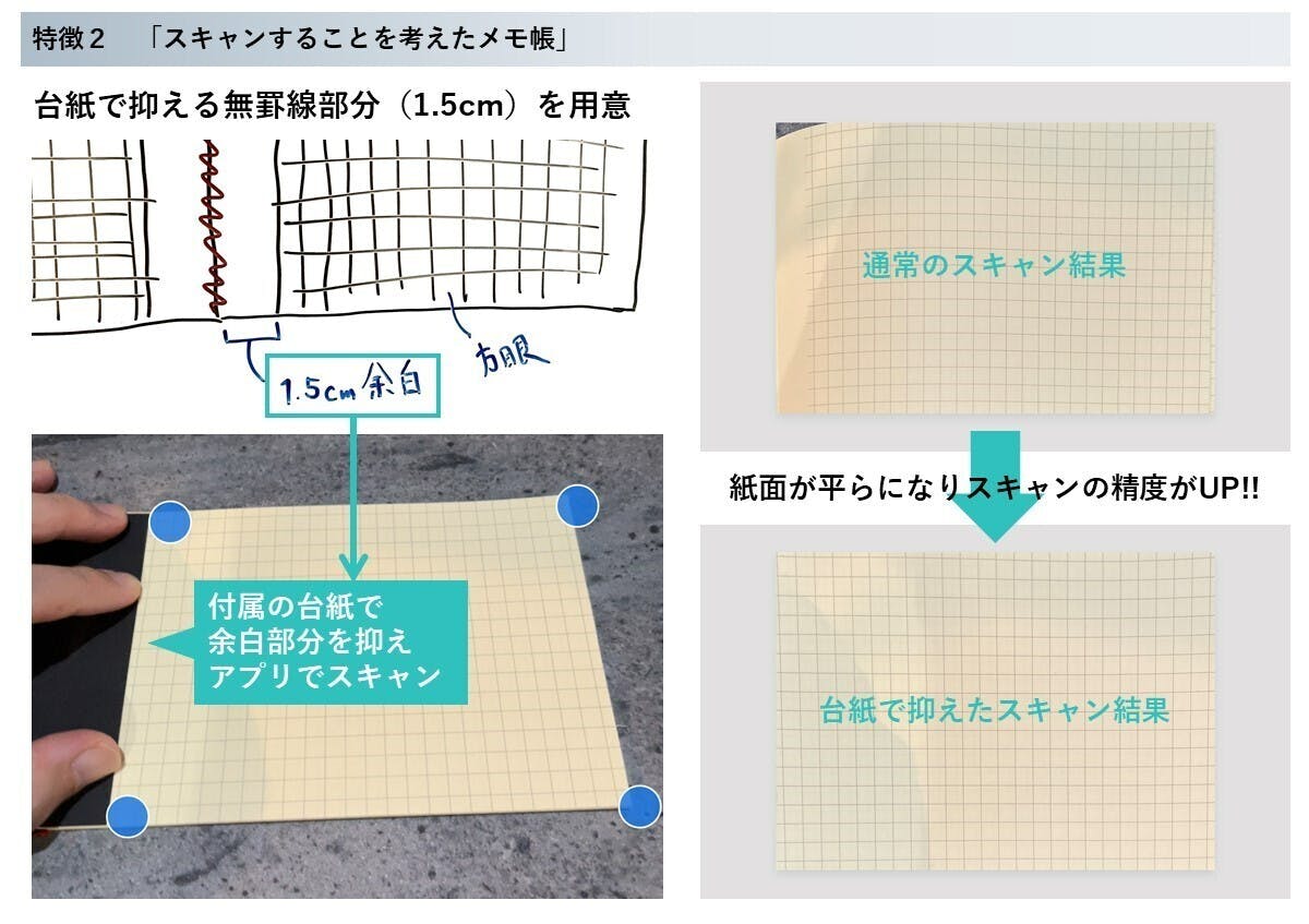 付属の台紙でこちらを抑えてアプリのスキャン機能を使用して頂くと、メモ帳の面が平らになり、スキャンの精度がより向上するように工夫しています。