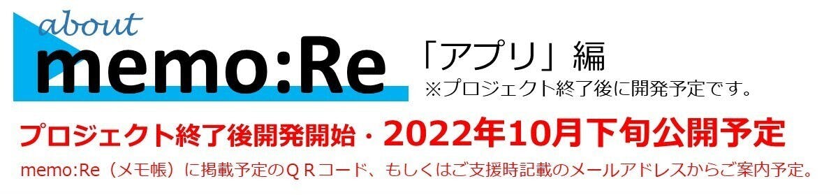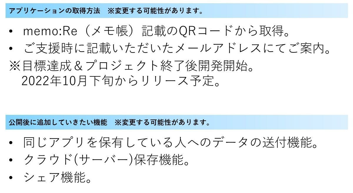 ・memo:Re(アプリ)のリリースは、2022年10月下旬を予定しています。なお、目標金額に届かなかった場合は、アプリケーションの開発も中止となりますこと、ご容赦ください。