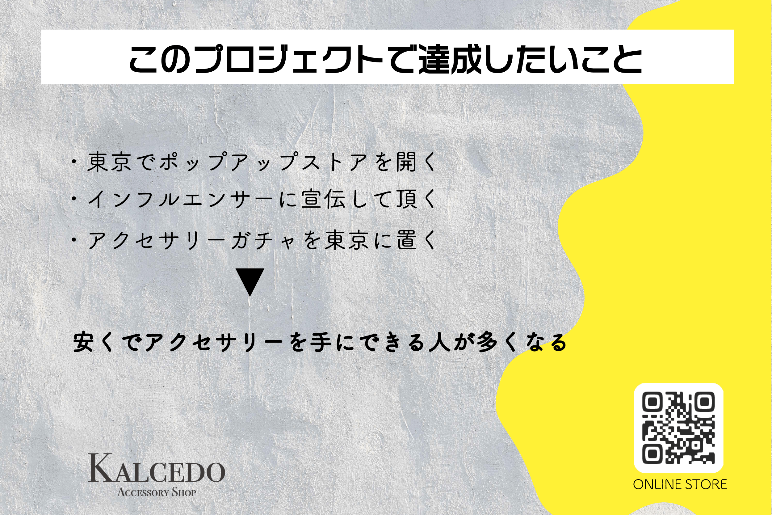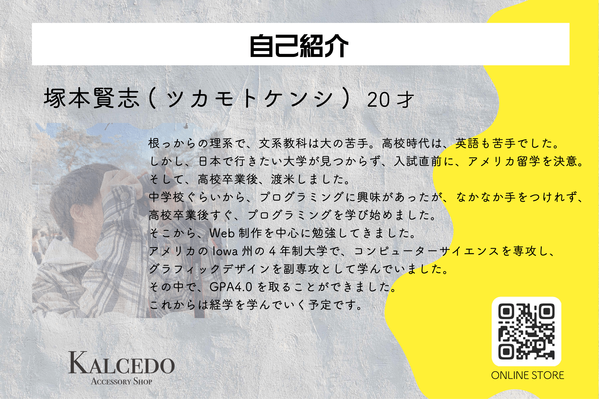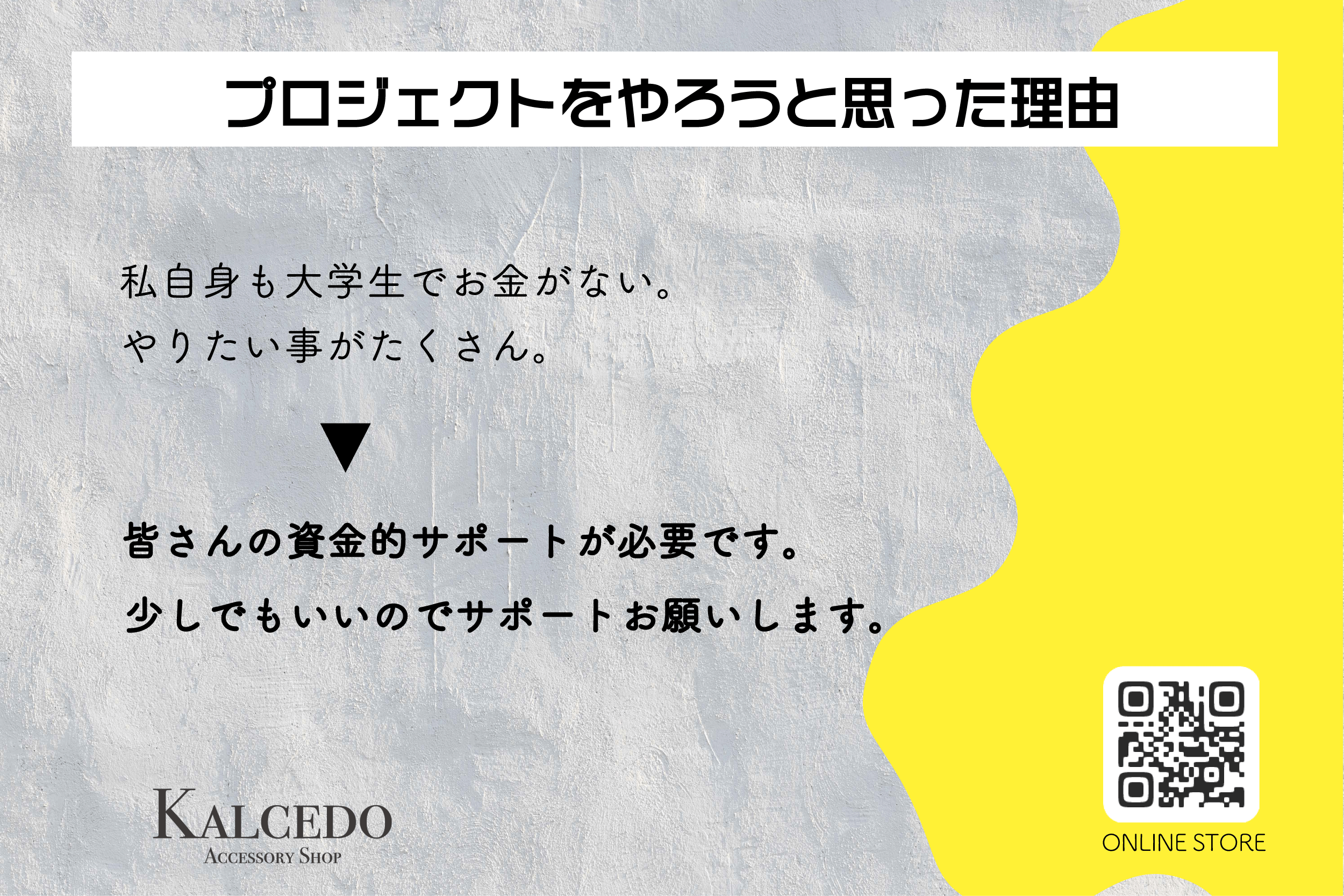 特に男性の方々のためのアクセサリーブランドは少なく、アクセサリーを買うとなると高価になってしまう。結果として、お金のない学生は、資金に縛られファッションを存分に楽しめない。そんな方々を一人でも多く救おうと考えこの"KALCEDO"を立ち上げました。