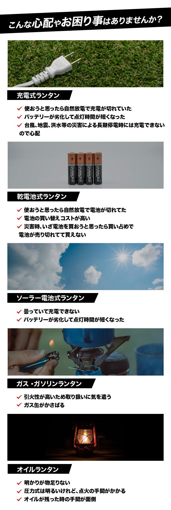 電池式・充電池式のランタンは保管しっぱなしにすると自然放電で必要な時に使用できなかったり、バッテリーの劣化を防ぐため定期的に使用&充電を繰り返さなければなりませんが、ルミナイザーランタンはいつでも必要な時に使用可能です。