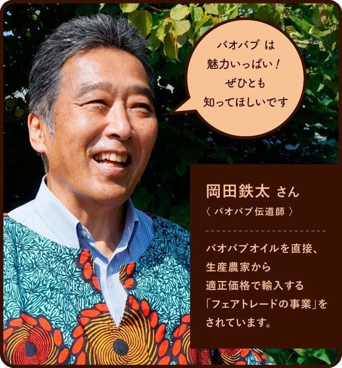 バオバブオイルを提供くださる「バオバブサンライズ・岡田さん」とは仕事のつながりでご紹介いただきました。実際にオイルを使用し、その魅力に取り憑かれた私たちはこれを中心にブランドづくりすることを決意しました。