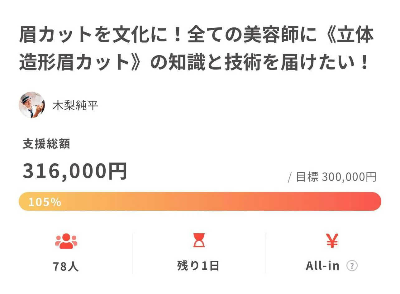 金額を集めることが目的というよりは、認知のためのクラファン。とはいえ、目標に届かないのも悔しいしと取り組んで、たくさんの方がシェアしてくださり、美容師さんにも少しでも届いたことが嬉しく思います。