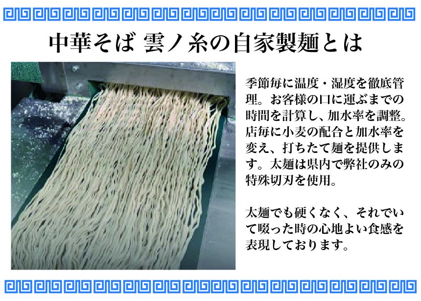 季節毎に温度・湿度を徹底管理。お客様の口に運ぶまでの時間を計算し、加水率を調整。店毎に小麦の配合と加水率を変え、打ちたて麺を提供します。太麺は県内で弊社のみの特殊切刃を使用。