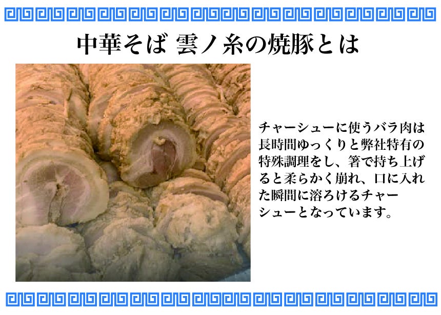 チャーシューに使うバラ肉は長時間ゆっくりと調理し、箸で持ち上げると柔らかく崩れ、口に入れた瞬間に溶ろけるチャーシューとなっています。