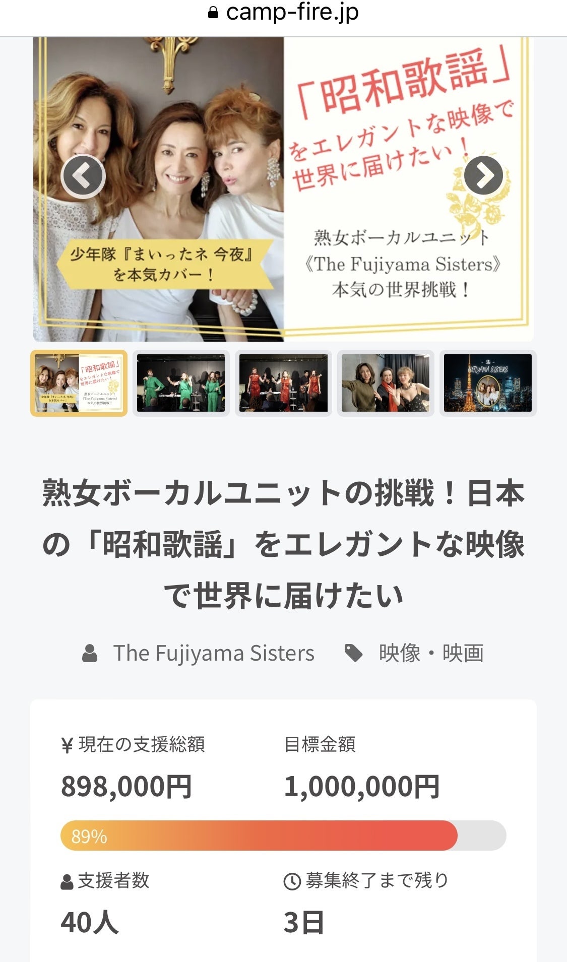 皆様、ありがとうございます!!昨夜22時の時点で目標額 70%達成だったのですが、何と1日で89.8%に上昇!!皆様の熱い応援に感謝の言葉しかありません。我々の応援団はどうしても中高年の方が多く、クラファンに馴染みがなく、IT機器の操作も苦手なので苦戦を覚悟していましたが、ここまで来ることが出来、感無量です。正直、「無謀な挑戦?」とドキドキしていました。ご協力、本当に感謝です。あと3日になりました。引き続き、最後の応援よろしくお願い致します。