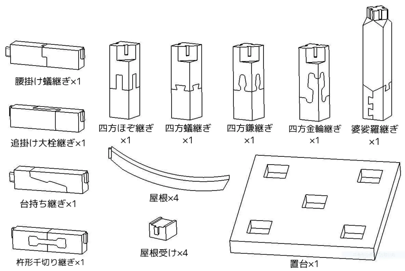 A.腰掛け蟻継ぎ(こしかけありつぎ)、追掛け大栓継ぎ(おっかけだいせんつぎ)、台持ち継ぎ(だいもちつぎ) 、杵形千切り継ぎ(きねがたちぎりつぎ):(約)30×40×161mm
