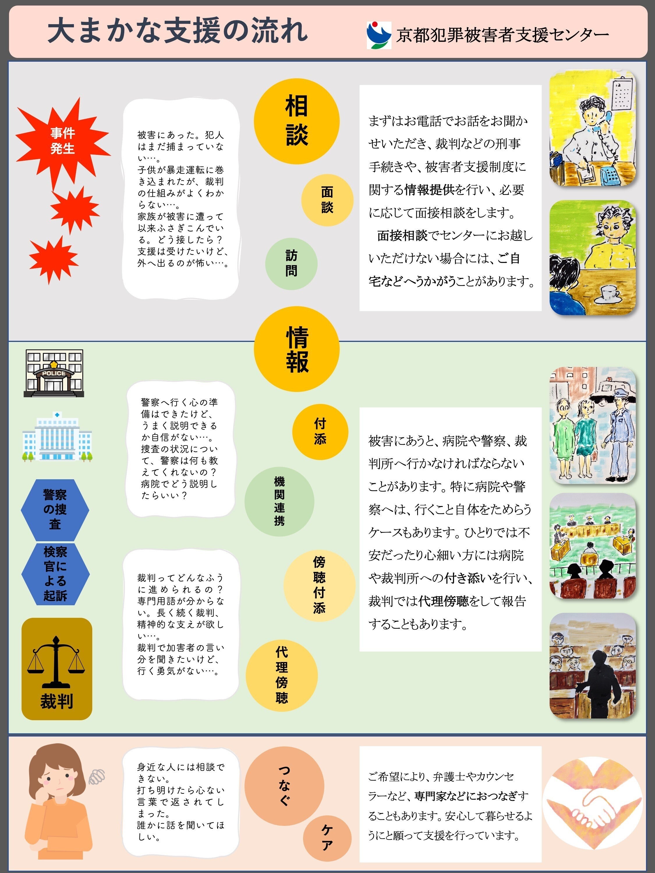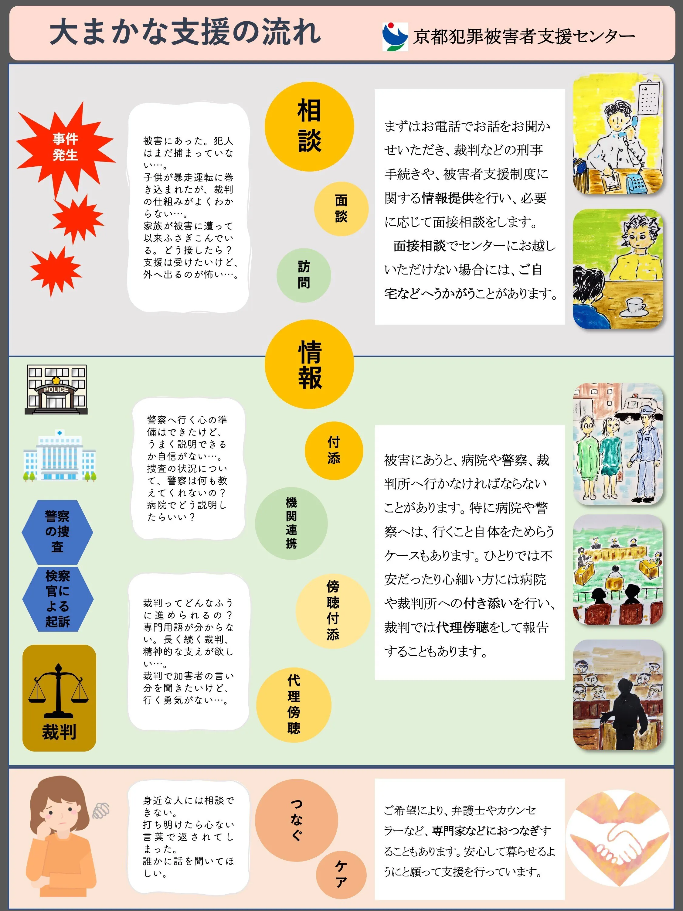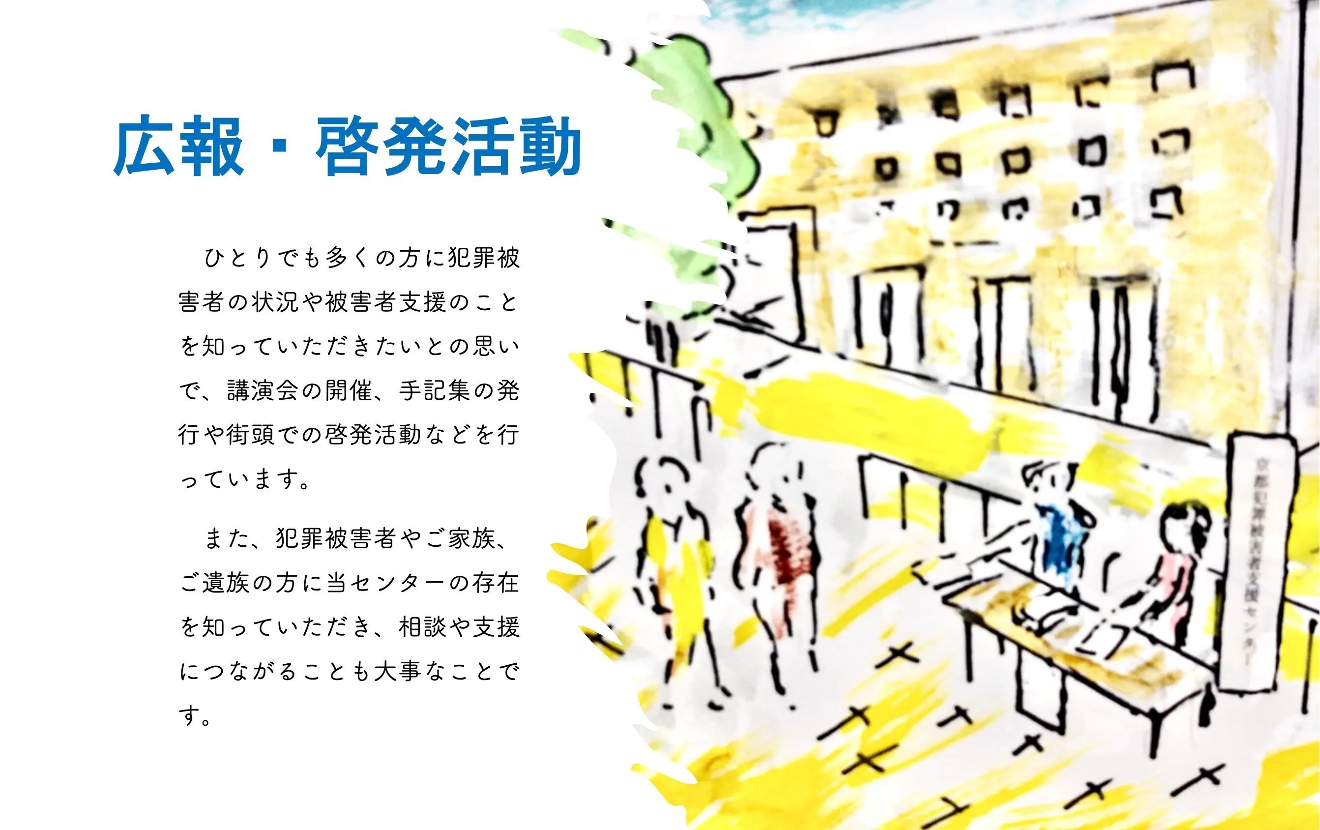 京都犯罪被害者支援センターは『社会全体で犯罪被害者を支える』という理念のもと、犯罪被害者やご家族が社会から孤立せず平穏な暮らしを取り戻すための支援を行っています。