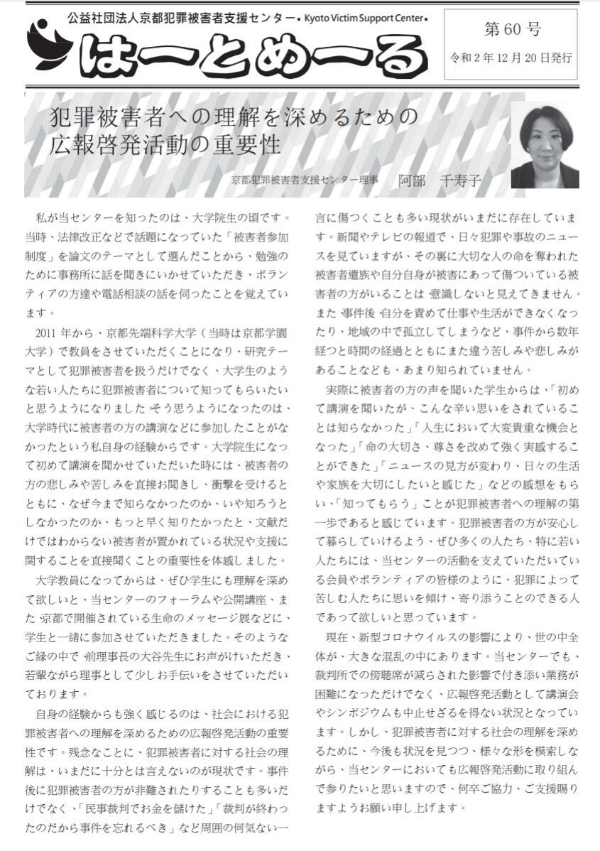当センターでは、会報紙『はーとめーる』を年3回発行しております。いただいたご寄付はこのような活動へ使わせていただくという一例として、『はーとめーる』第60号(令和2年12月20日発行)のコラムを掲載いたします。お時間のある時にでも、ぜひご一読いただければ幸いです。