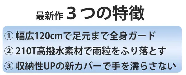 そこで、直径を既存の102センチから120センチに。18センチも大きくなった超広サイズで足元までしっかり雨から守ります。