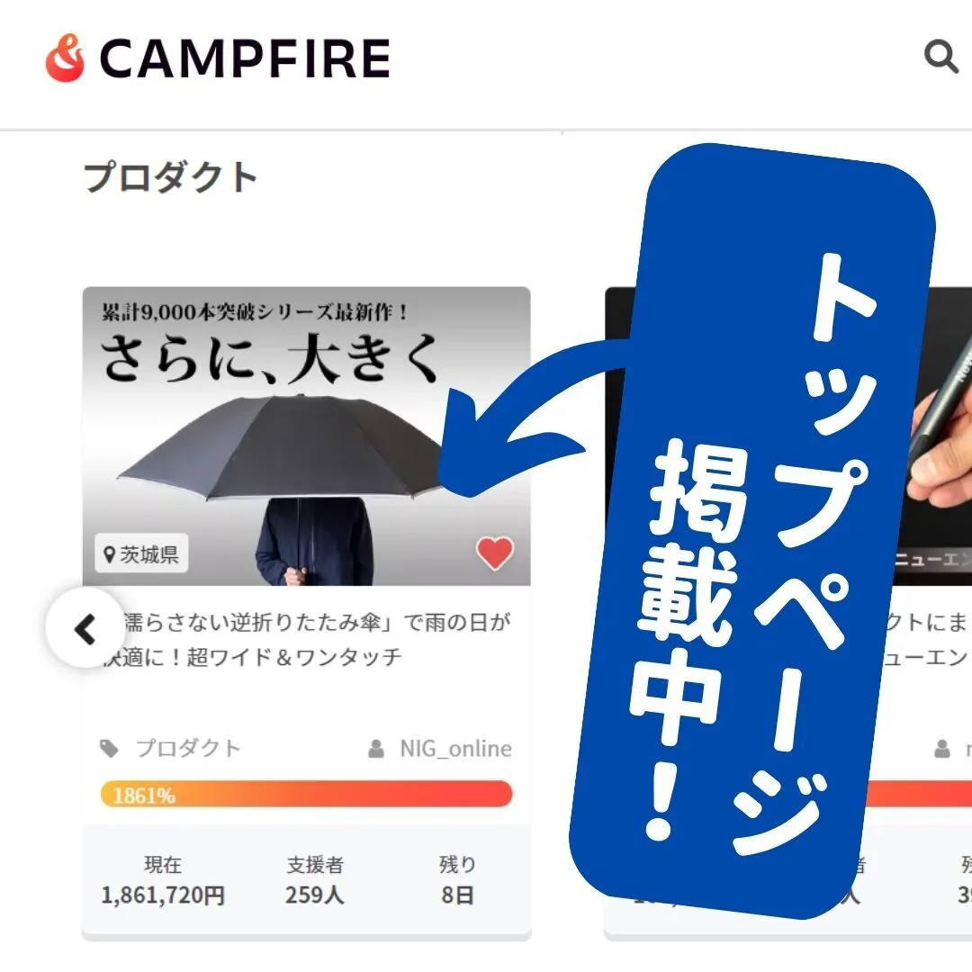 現在CAMP FIREのトップページに本プロジェクト「「濡らさない逆折りたたみ傘」で雨の日が快適に!超ワイド&ワンタッチ」が掲載されています!