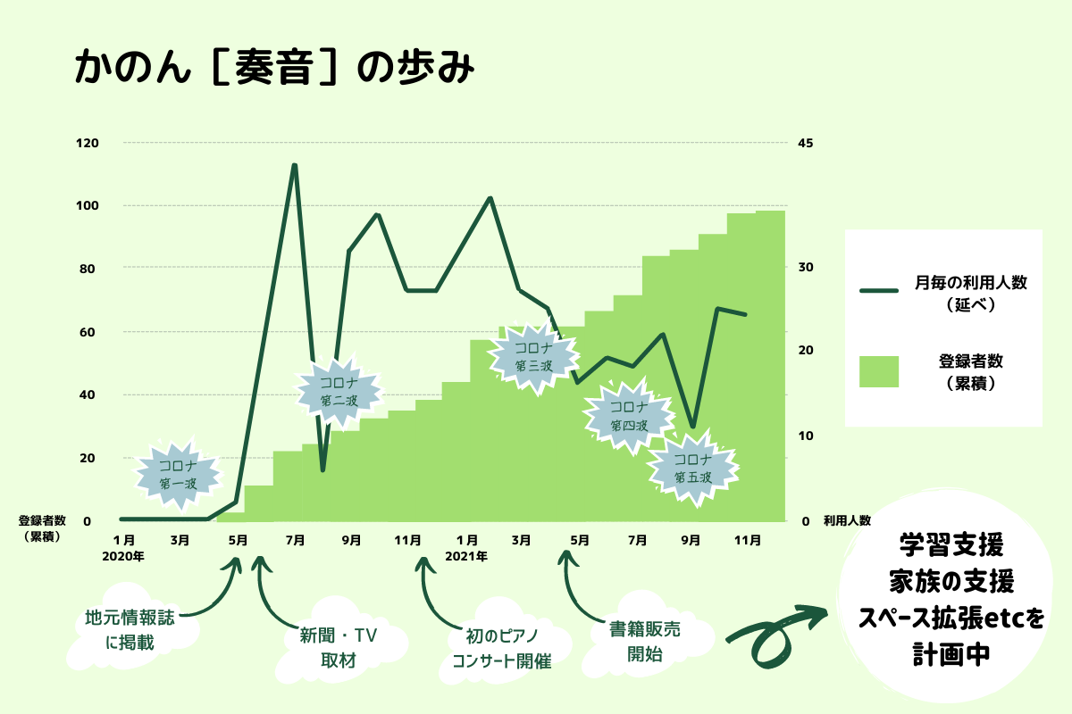 今は、私たちが中心となってかのん[奏音]を運営しています。これからは、地域の大人たちに私たちの活動を知って欲しい、大人達もかのん[奏音]を利用して欲しい、そして子どもたちの成長を見守って欲しい、と願っています。そのため、大人も利用できるように、書籍の充実を図ろうと思います。幸い、ビルオーナー様の御厚意で、同じフロアのテナントをお借りすることができるようになりました。大人も利用できるようにすることで、地域で子どもたちの成長を見守る場にしたいと思います。