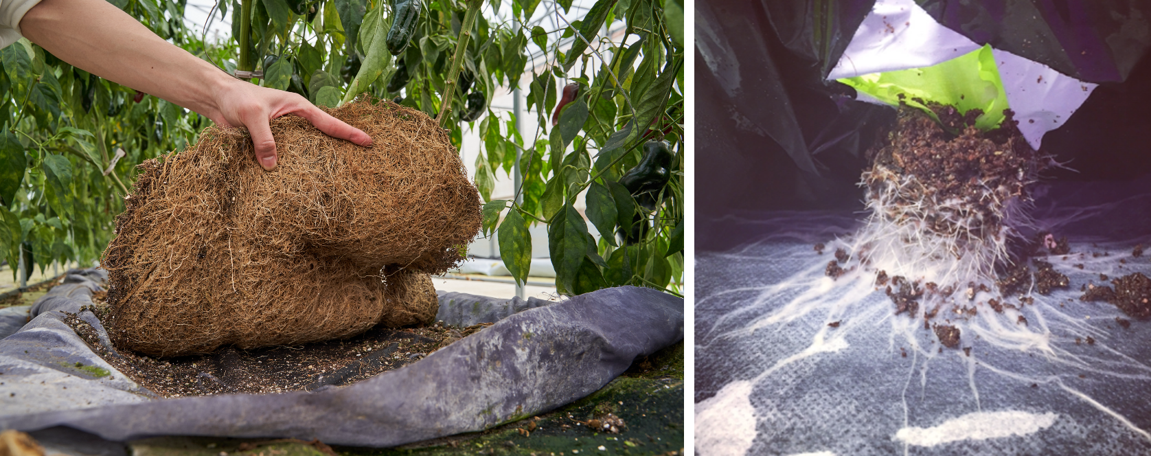 Pomona Farmでは、Moiscultureを用いて様々な作物を栽培しています。(右)発生する湿気中根
